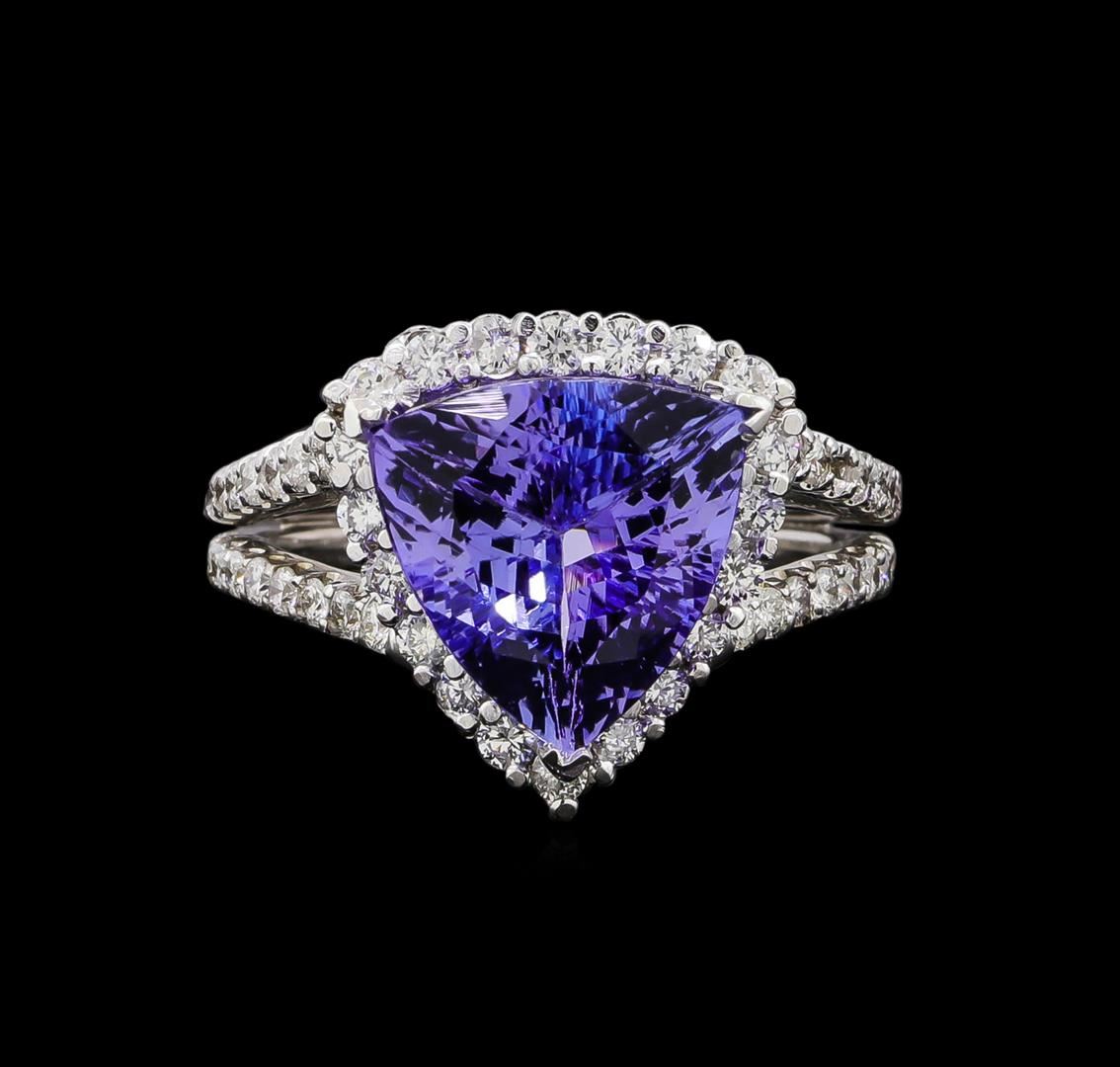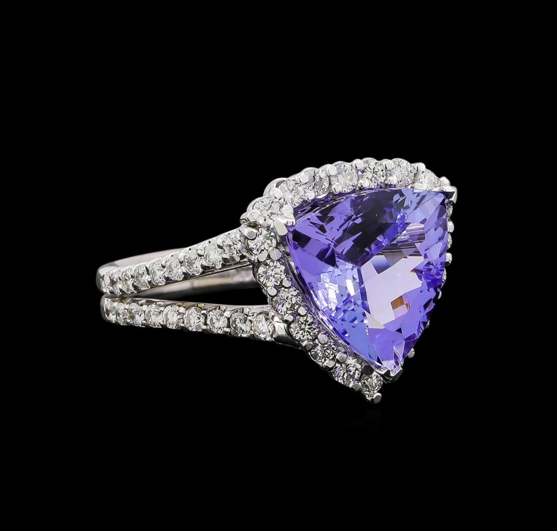 One electronically tested 14KT white gold ladies cast tanzanite and diamond ring with a bright polish finish. Identified with markings of "14K". Condition is new. Containing: One prong set triangle modified brilliant cut natural tanzanite, measuring 11.50 x 11.50 x 6.00mm, approximate weight of 4.78ct., clarity is eye clean, type I, medium light, very slightly grayish, violet color, (GIA V 4/3), cut is good. Fifty-Six prong set round brilliant cut diamonds, measuring 1.40 - 1.40 x 0.84mm (depth est.) approximate total weight of 56 Stones = 0.56ct. Clarity: SI-1 to I-1. Color: I - J, Cut is Good. Colored gemstones are presumed to have been subjected to commonly used enhancement processes. All diamonds and colored gemstones are graded in the mounting, unless otherwise stated. Total Weight of Colored Stones 4.78ct. Total Weight of Diamonds 0.56ct. Total Weight of Ring 6.10 grams. GGL Appraised at $4,615.00.