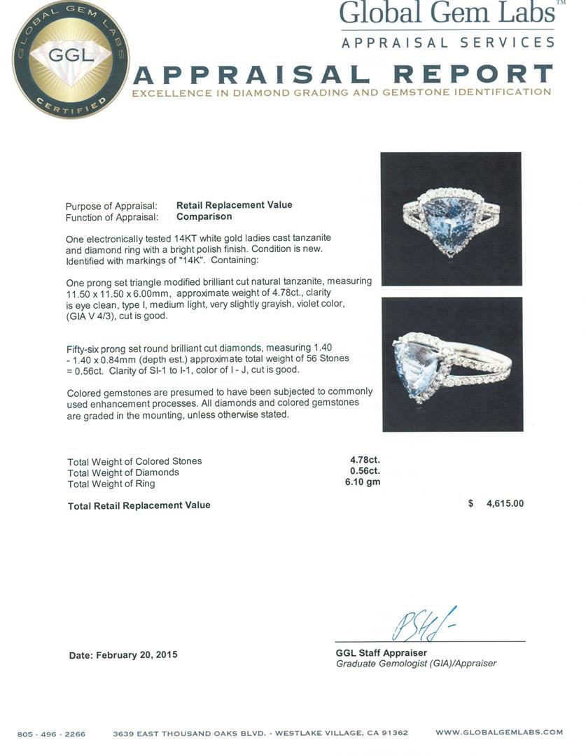 One electronically tested 14KT white gold ladies cast tanzanite and diamond ring with a bright polish finish. Identified with markings of "14K". Condition is new. Containing: One prong set triangle modified brilliant cut natural tanzanite, measuring 11.50 x 11.50 x 6.00mm, approximate weight of 4.78ct., clarity is eye clean, type I, medium light, very slightly grayish, violet color, (GIA V 4/3), cut is good. Fifty-Six prong set round brilliant cut diamonds, measuring 1.40 - 1.40 x 0.84mm (depth est.) approximate total weight of 56 Stones = 0.56ct. Clarity: SI-1 to I-1. Color: I - J, Cut is Good. Colored gemstones are presumed to have been subjected to commonly used enhancement processes. All diamonds and colored gemstones are graded in the mounting, unless otherwise stated. Total Weight of Colored Stones 4.78ct. Total Weight of Diamonds 0.56ct. Total Weight of Ring 6.10 grams. GGL Appraised at $4,615.00.