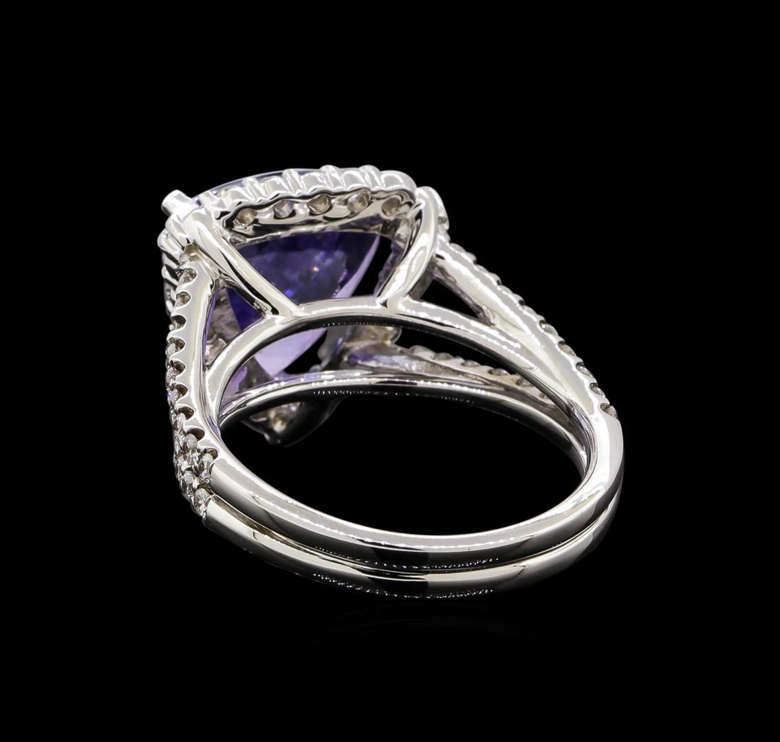 One electronically tested 14KT white gold ladies cast tanzanite and diamond ring with a bright polish finish. Identified with markings of "14K". Condition is new. Containing: One prong set triangle modified brilliant cut natural tanzanite, measuring 11.50 x 11.50 x 6.00mm, approximate weight of 4.78ct., clarity is eye clean, type I, medium light, very slightly grayish, violet color, (GIA V 4/3), cut is good. Fifty-Six prong set round brilliant cut diamonds, measuring 1.40 - 1.40 x 0.84mm (depth est.) approximate total weight of 56 Stones = 0.56ct. Clarity: SI-1 to I-1. Color: I - J, Cut is Good. Colored gemstones are presumed to have been subjected to commonly used enhancement processes. All diamonds and colored gemstones are graded in the mounting, unless otherwise stated. Total Weight of Colored Stones 4.78ct. Total Weight of Diamonds 0.56ct. Total Weight of Ring 6.10 grams. GGL Appraised at $4,615.00.
