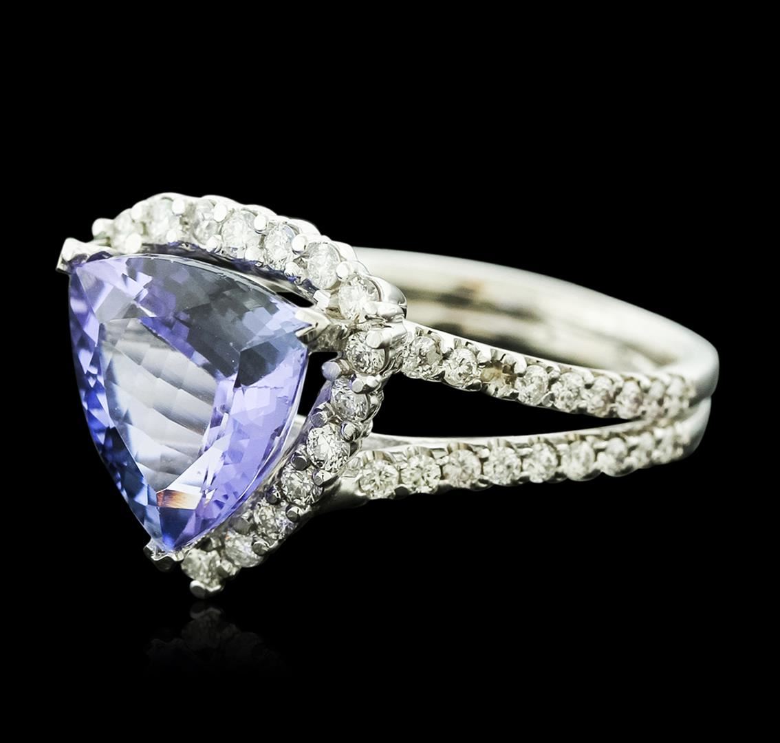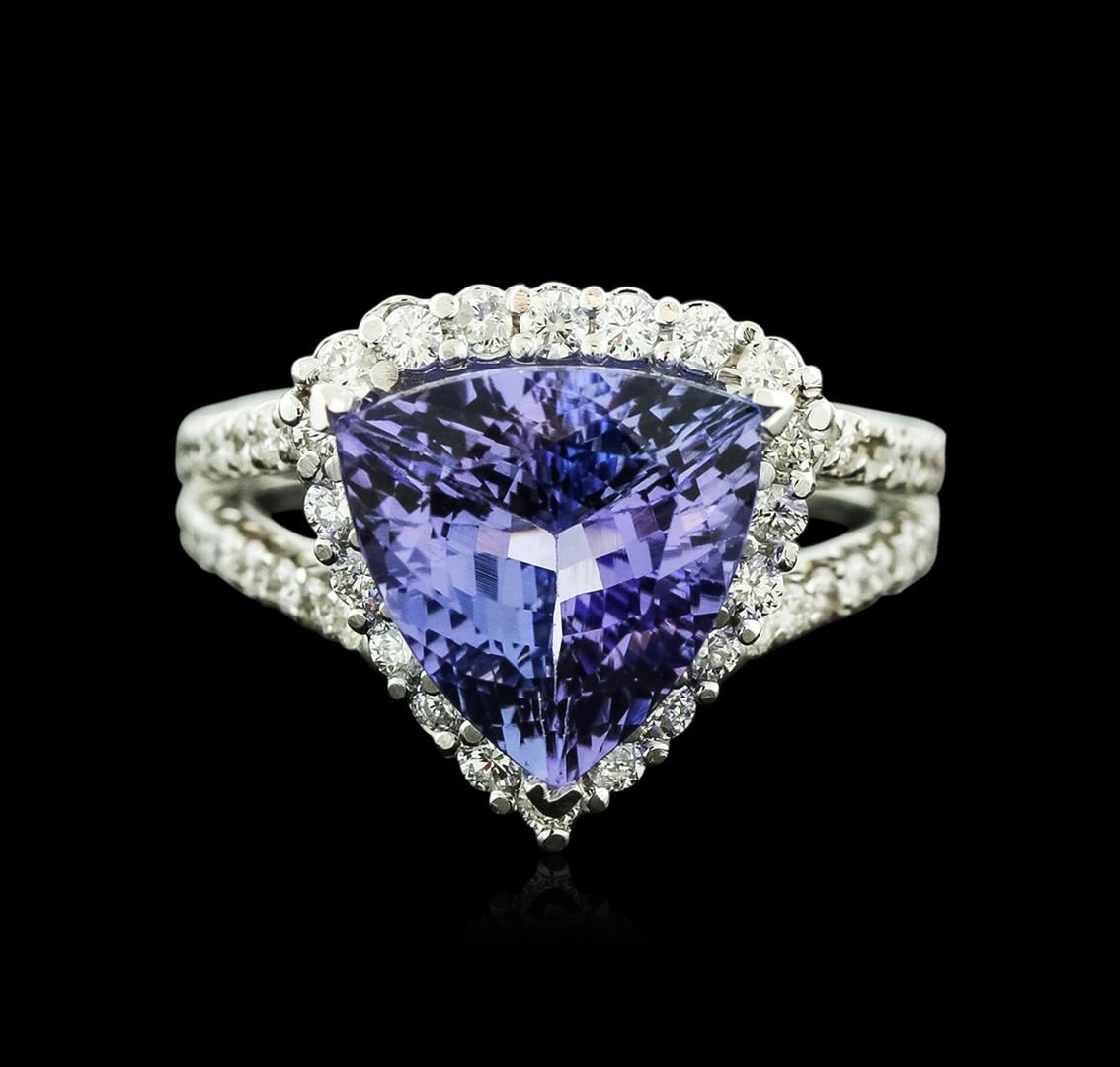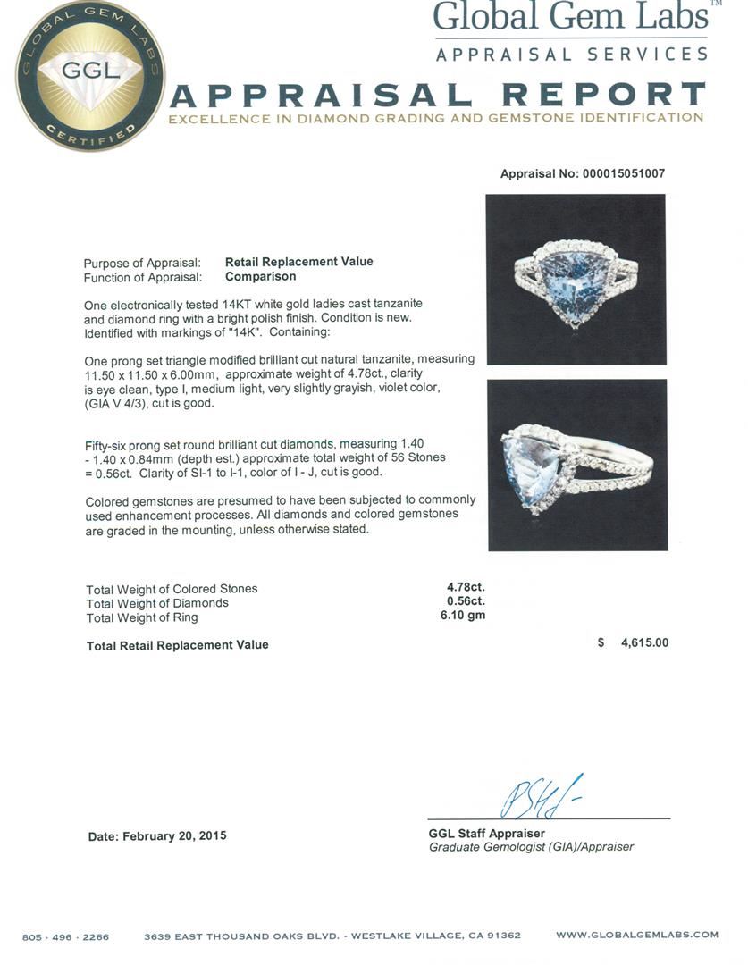 One electronically tested 14KT white gold ladies cast tanzanite and diamond ring with a bright polish finish. Identified with markings of "14K". Condition is new. Containing: One prong set triangle modified brilliant cut natural tanzanite, measuring 11.50 x 11.50 x 6.00mm, approximate weight of 4.78ct., clarity is eye clean, type I, medium light, very slightly grayish, violet color, (GIA V 4/3), cut is good. Fifty-Six prong set round brilliant cut diamonds, measuring 1.40 - 1.40 x 0.84mm (depth est.) approximate total weight of 56 Stones = 0.56ct. Clarity: SI-1 to I-1. Color: I - J, Cut is Good. Colored gemstones are presumed to have been subjected to commonly used enhancement processes. All diamonds and colored gemstones are graded in the mounting, unless otherwise stated. Total Weight of Colored Stones 4.78ct. Total Weight of Diamonds 0.56ct. Total Weight of Ring 6.10 grams. GGL Appraised at $4,615.00.