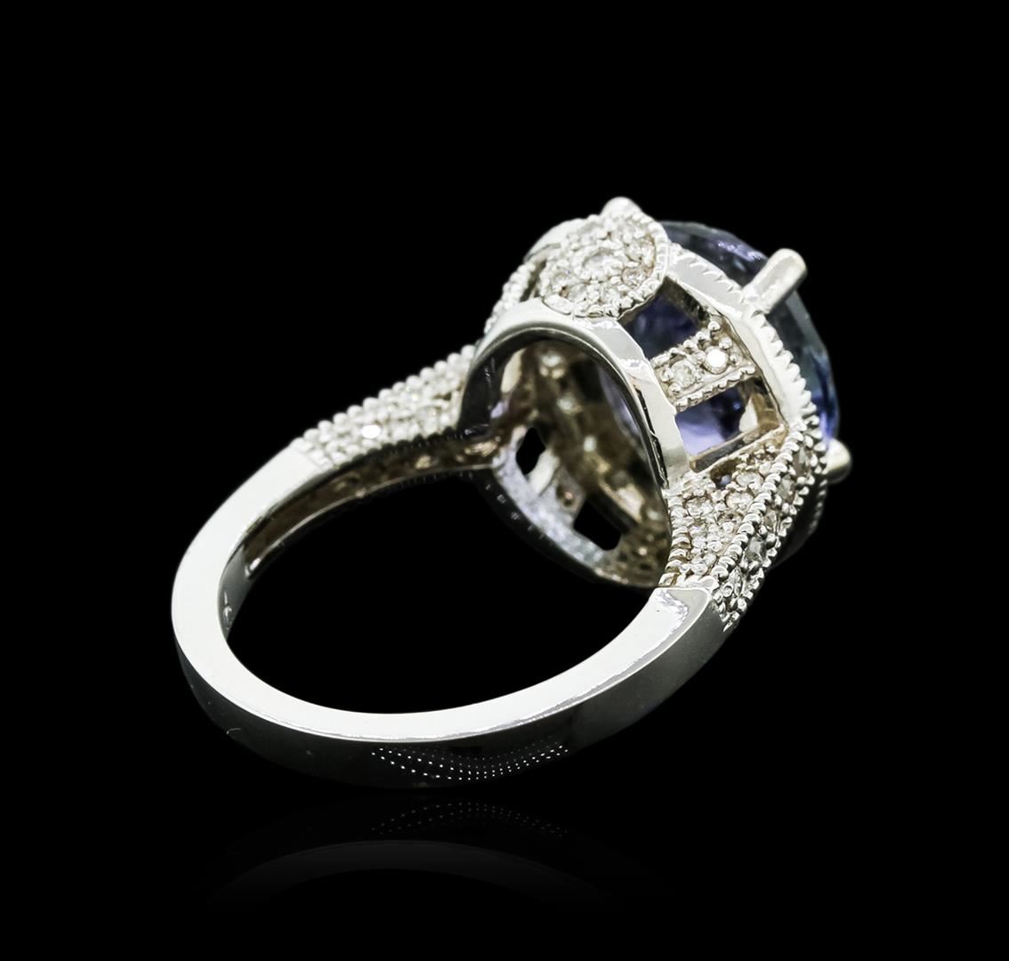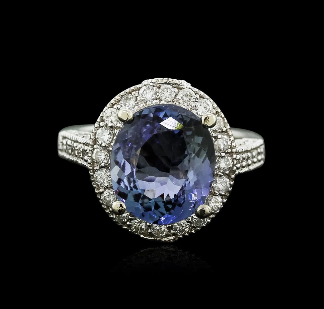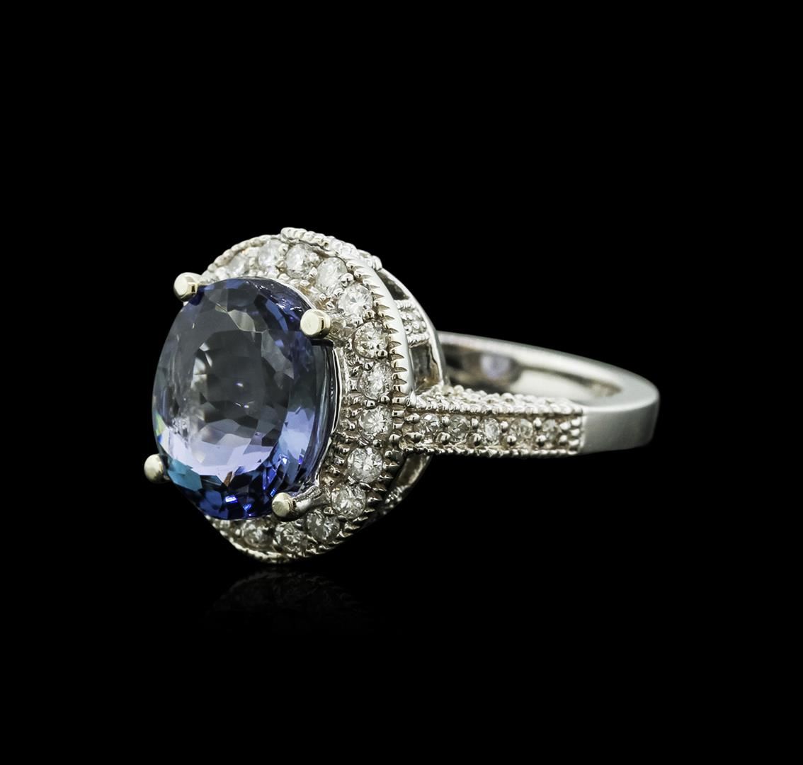 One polished, stamped, and tested 14K white gold ring mounted with: 1 genuine tanzanite center stone weighing 4.79 carat, and 90 genuine round diamonds weighing 0.86 carats. This item weighs 7.9 grams, condition is new, excellent workmanship. MAIN GEMSTONE: Species: Natural Zoisite. Variety: Tanzanite. Shape: Oval. Cutting Style: Brilliant Cut Crown Step Cut Pavilion. Measurements: 11.79 x 10.32 mm. Weight: 4.79 carat. Color: Violetish Blue. Cut Grade: Very Good. Refractive Index: 1.691 - 1.700 DR. Birefringence: 0.008 - 0.013. Hardness: 6.5 - 7. ADJACENT GEMSTONES ON RING: Identity: Natural Diamond. Shape: Round. Cutting Style: Brilliant Cut. Quantity: 90 Diamonds. Measurements: 1.0 - 1.7 mm. Total Weight: 0.86 carats. Clarity Grade: SI1 - SI2. Color Grade: F - H. Refractive Index: 2.418. Hardness: 10. Tanzanite Weight: 4.79 ct. Total Diamond Weight: 0.86 cts. Weight of Item: 7.9 grams. Gold Content: 14K White Gold. AIGL Appraised at $9,080.00.