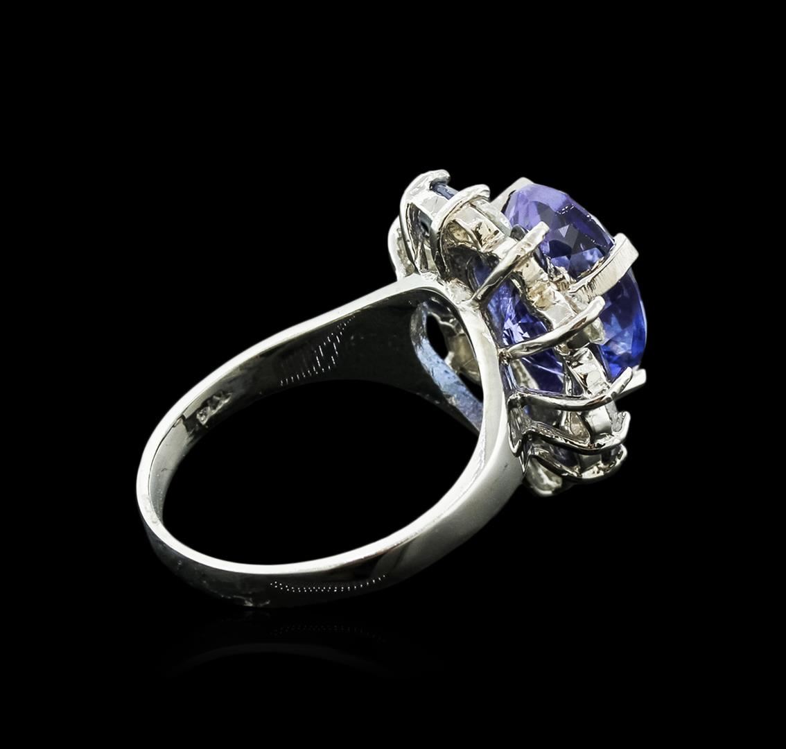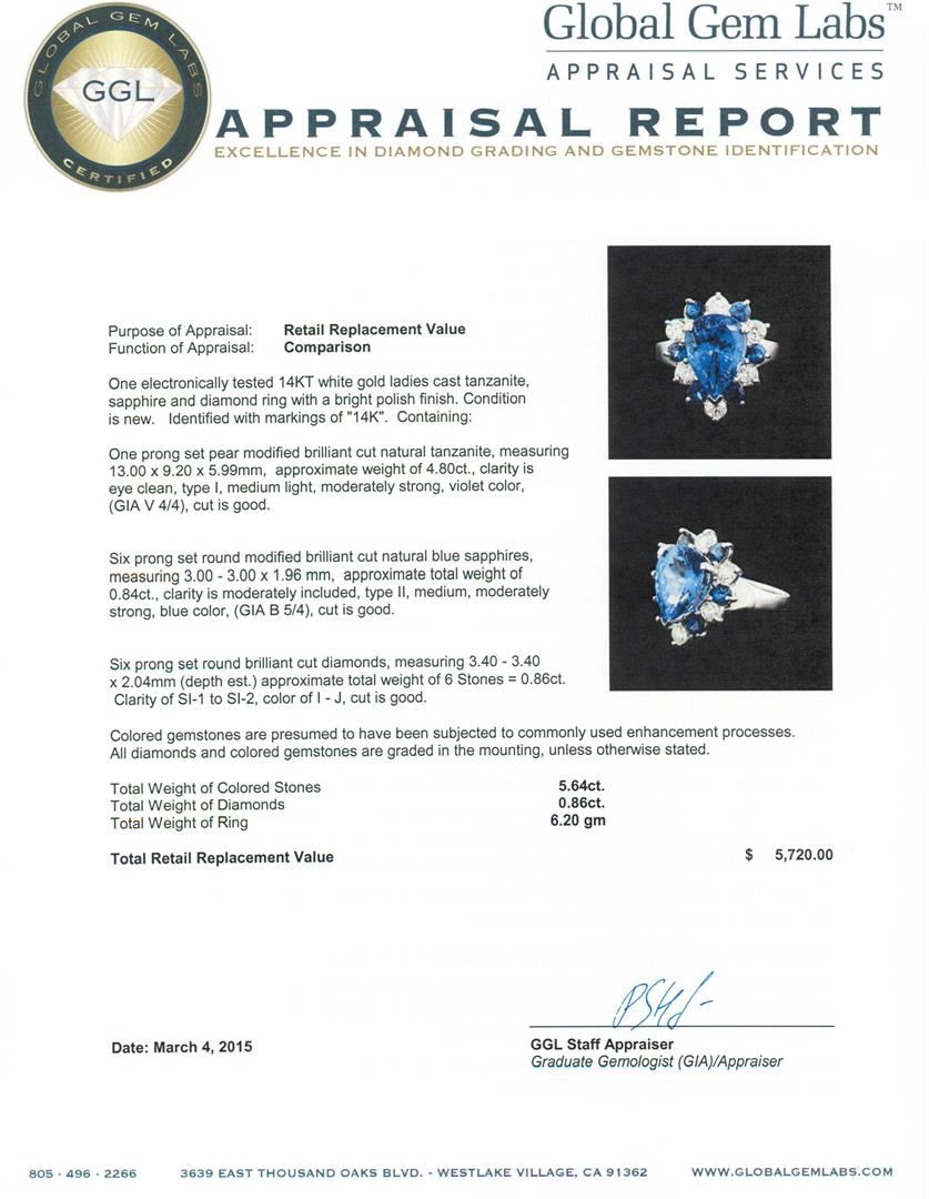 One electronically tested 14KT white gold ladies cast tanzanite, sapphire and diamond ring with a bright polish finish. Identified with markings of "14K". Condition is new. Containing: One prong set pear modified brilliant cut natural tanzanite, measuring 13.00. x 9.20 x 5.99mm, approximate weight of 4.80ct., clarity is eye clean, type I, medium light, moderately strong, violet color, (GIA V 4/4), cut is good. Six prong set round modified brilliant cut natural blue sapphires, measuring 3.00. - 3.00. x 1.96 mm, approximate total weight of 0.84ct., clarity is moderately included, type II, medium, moderately strong, blue color, (GIA B 5/4), cut is good. Six prong set round brilliant cut diamonds, measuring 3.40 - 3.40 x 2.04mm (depth est.) approximate total weight of 6 Stones = 0.86ct. Clarity: SI-1 to SI-2. Color: I - J, Cut is Good. Colored gemstones are presumed to have been subjected to commonly used enhancement processes. All diamonds and colored gemstones are graded in the mounting, unless otherwise stated. Total Weight of Colored Stones 5.64ct. Total Weight of Diamonds 0.86ct. Total Weight of Ring 6.20 grams. GGL Appraised.