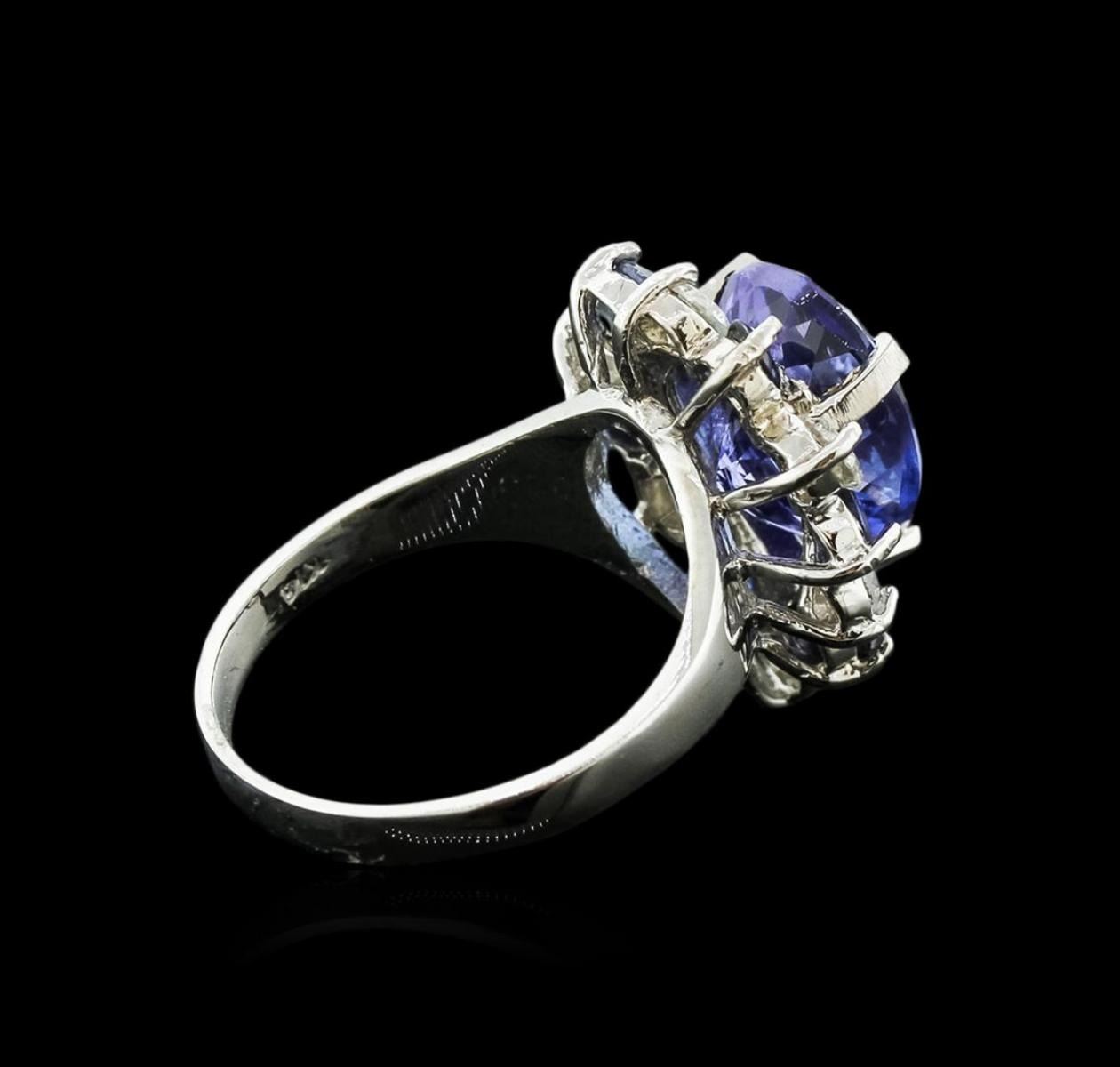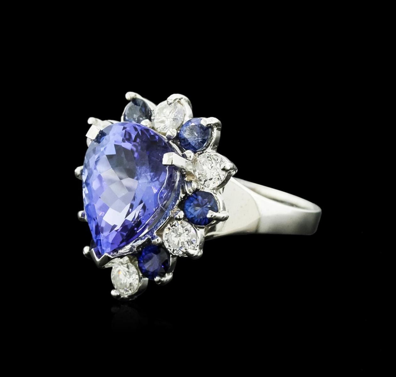 One electronically tested 14KT white gold ladies cast tanzanite, sapphire and diamond ring with a bright polish finish. Identified with markings of "14K". Condition is new. Containing: One prong set pear modified brilliant cut natural tanzanite, measuring 13.00. x 9.20 x 5.99mm, approximate weight of 4.80 ct., clarity is eye clean, type I, medium light, moderately strong, violet color, (GIA V 4/4), cut is good. Six prong set round modified brilliant cut natural blue sapphires, measuring 3.00. - 3.00. x 1.96 mm, approximate total weight of 0.84ct., clarity is moderately included, type II, medium, moderately strong, blue color, (GIA B 5/4), cut is good. Six prong set round brilliant cut diamonds, measuring 3.40 - 3.40 x 2.04mm (depth est.) approximate total weight of 6 Stones = 0.86ct. Clarity: SI-1 to SI-2. Color: I - J, Cut is Good. Colored gemstones are presumed to have been subjected to commonly used enhancement processes. All diamonds and colored gemstones are graded in the mounting, unless otherwise stated. Total Weight of Colored Stones 5.64ct. Total Weight of Diamonds 0.86ct. Total Weight of Ring 6.20 grams. GGL Appraised.