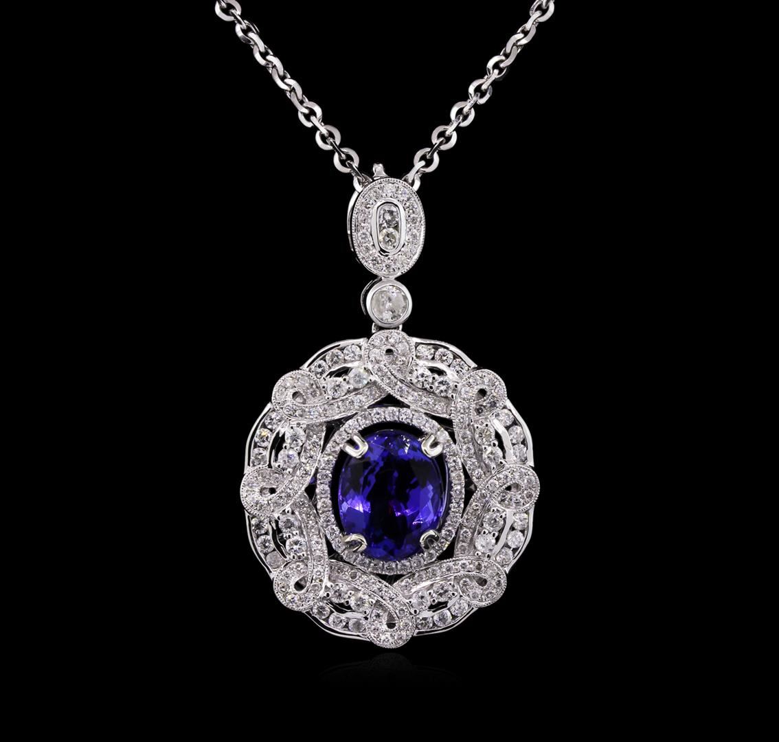 One electronically tested 14KT white gold Ladies combination cast & assembled pendant & chain 17.0" long, medium cable link with a lobster claw clasp with a bright polish finish. Condition is new. Identified with markings of "14K". Containing: One prong set round oval modified brilliant cut natural tanzanite, measuring 11.90 x 9.60 x 6.20mm, approximate weight of 4.80ct., clarity is eye clean, type I, medium light, very slightly grayish, violet color, (GIA V 4/3), cut is good. Colored gemstones are presumed to have been subjected to commonly used color/clarity enhancement processes. One bezel set round brilliant cut diamond, measuring 3.70 - 3.70 x 2.22mm (depth est.) approximate weight of 0.19ct. Clarity: I-2. Color: I, Cut is Good. One Hundred Seventy-Eight prong set round brilliant cut diamonds, measuring 1.90 - 1.30 x 0.96mm (depth est.) approximate. Total Weight of 178 Stones = 1.80ct. Clarity: I-1 to I-2. Color: I - J, Cut is Good. Total Weight of Colored Stones 4.80ct. Total Weight of Diamonds 1.99ct. Total Weight of Pendant & Chain 16.80 grams. GGL Appraised at $16,420.00.