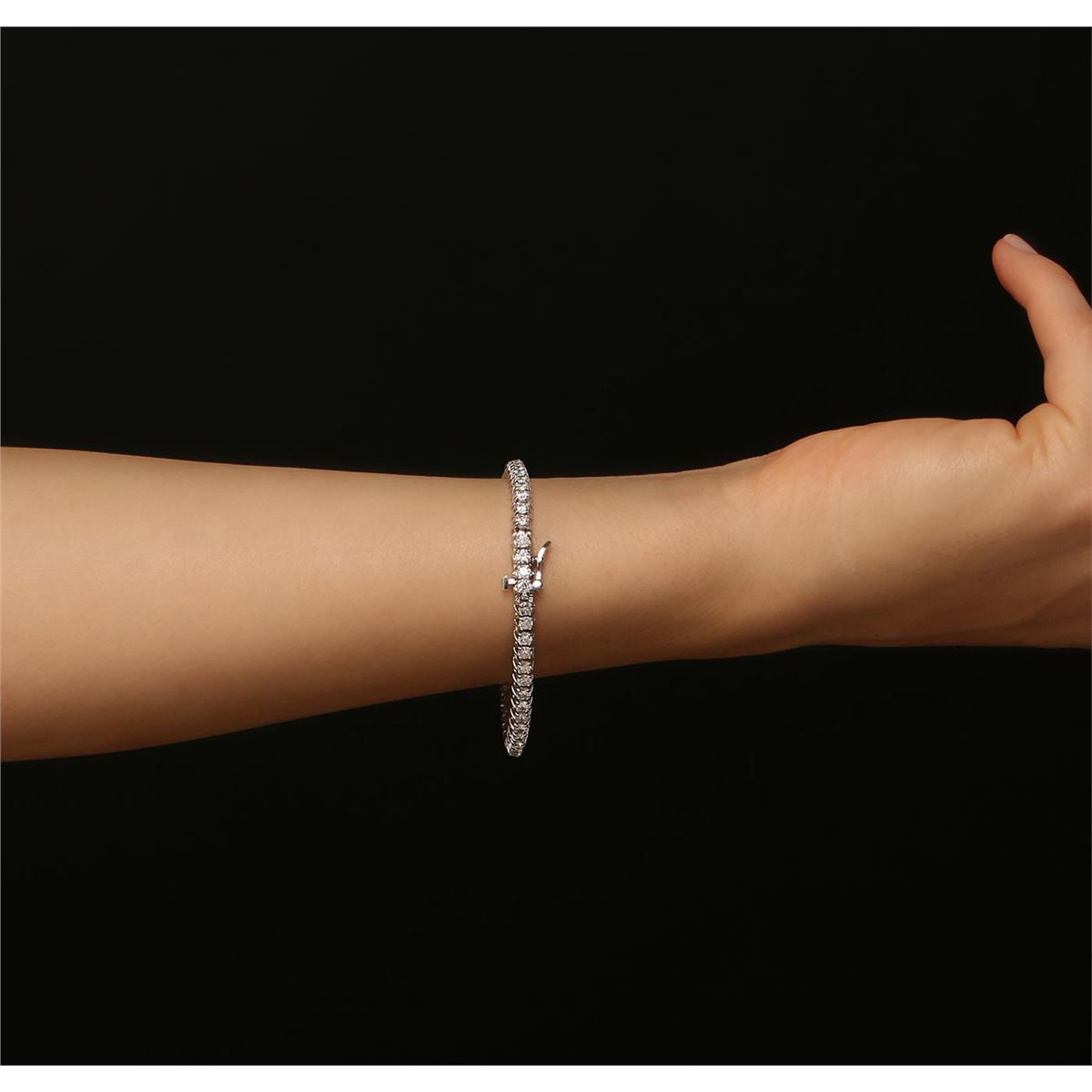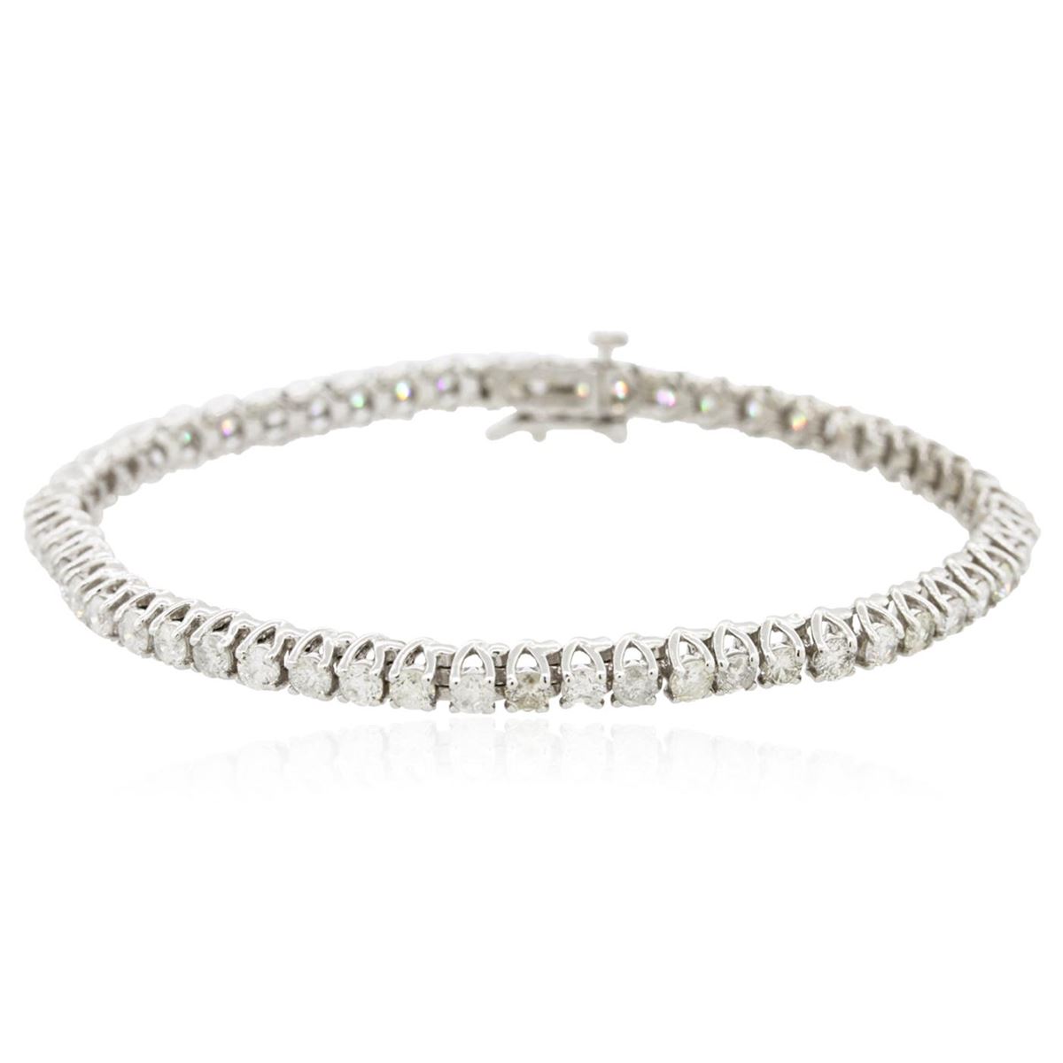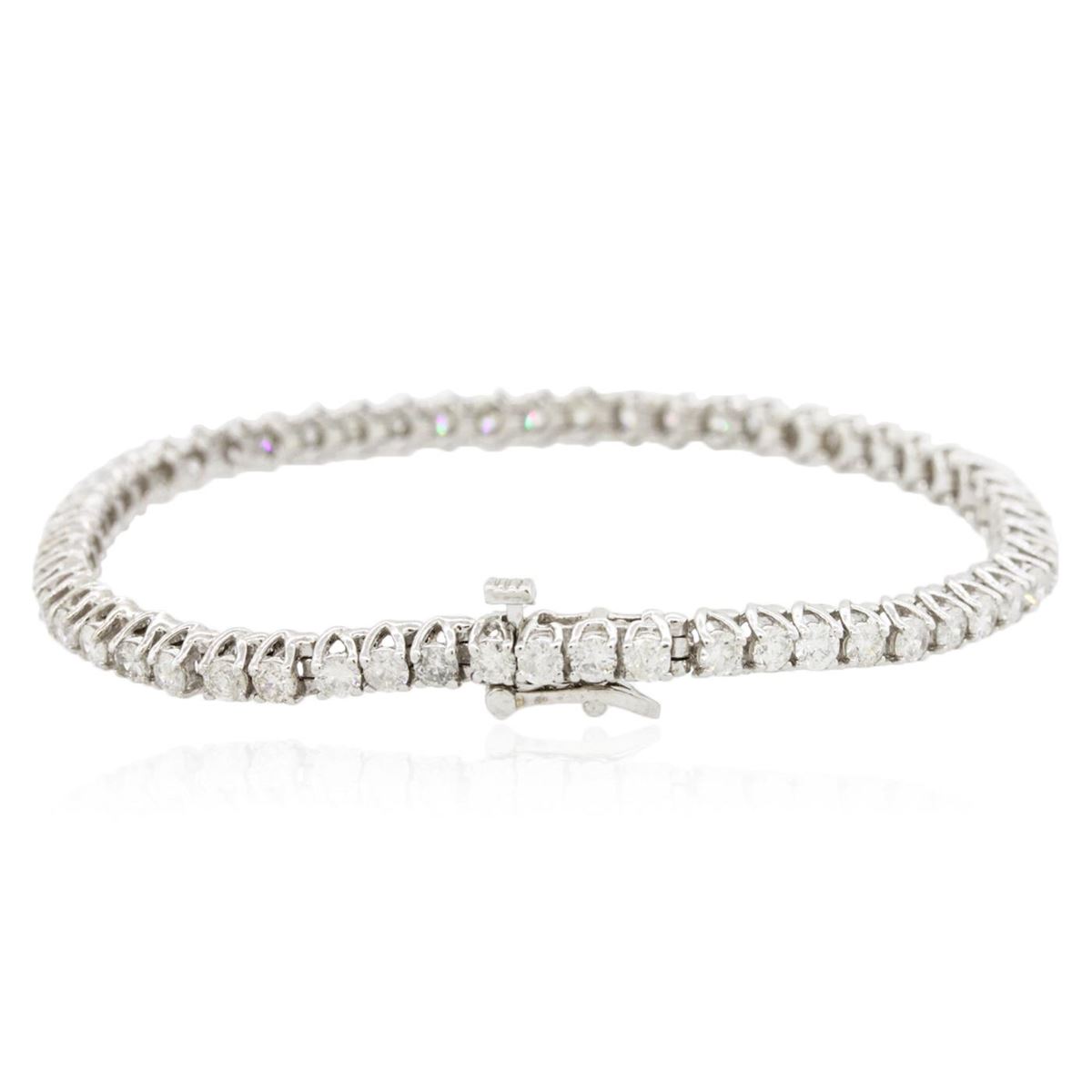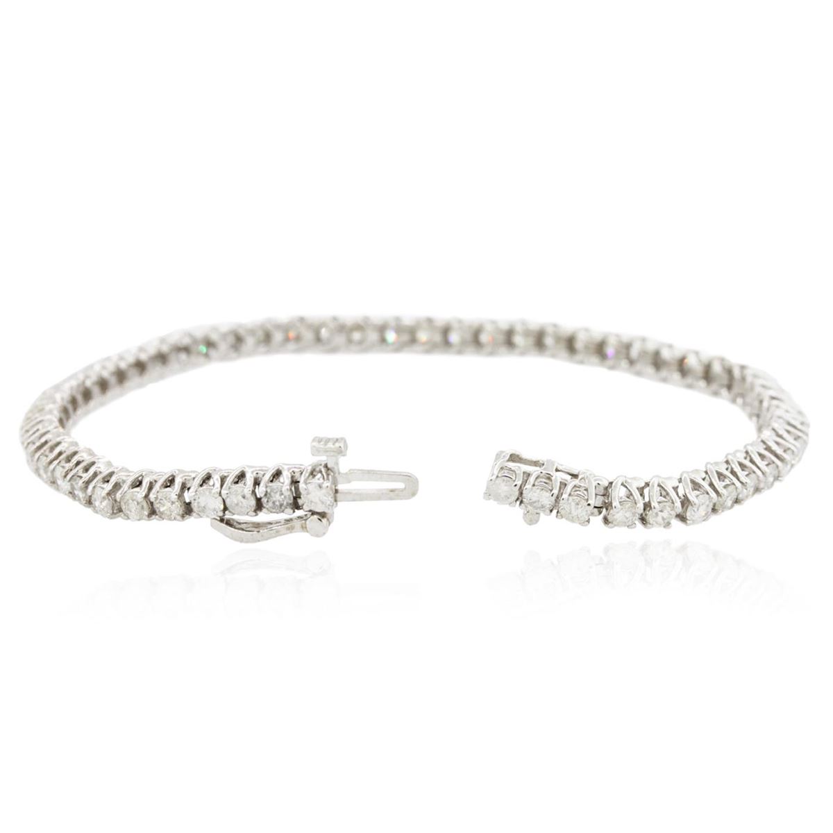 One electronically tested 14KT white gold ladies cast & assembled diamond tennis bracelet with a bright polish finish. Seven inch length bracelet composed of a flexible ribbon of diamonds, terminating in a concealed clasp with safety. Identified with markings of "14K". Condition is new, good workmanship. Tennis bracelets & necklaces got their unusual name from an incident involving the U.S. professional tennis player Chris Evert during a tennis match in the 1980's. Evert had been wearing an expensive diamond bracelet, an inline string of individually-set diamonds. Previously these bracelets were known as eternity bracelets. When the clasp snapped during play, she asked the officials to stop the tennis match until the bracelet could be found. Since that day, bracelets and necklaces featuring an inline string of diamonds have been called tennis bracelets and tennis necklaces. Containing: Fifty-Six prong set round brilliant cut diamonds, measuring 2.90 - 2.80 x 1.70mm (depth est.) approximate total weight of 56 Stones = 4.81ct. The color and clarity grade reflect the entire range of color and clarity for this group. Graded in the setting. Clarity: SI-1 to I-2 . Color: G - J. Total Weight of Diamonds 4.81ct. Total Weight of Tennis Bracelet 13.21 grams. AIG Appraised at $14,140.00.