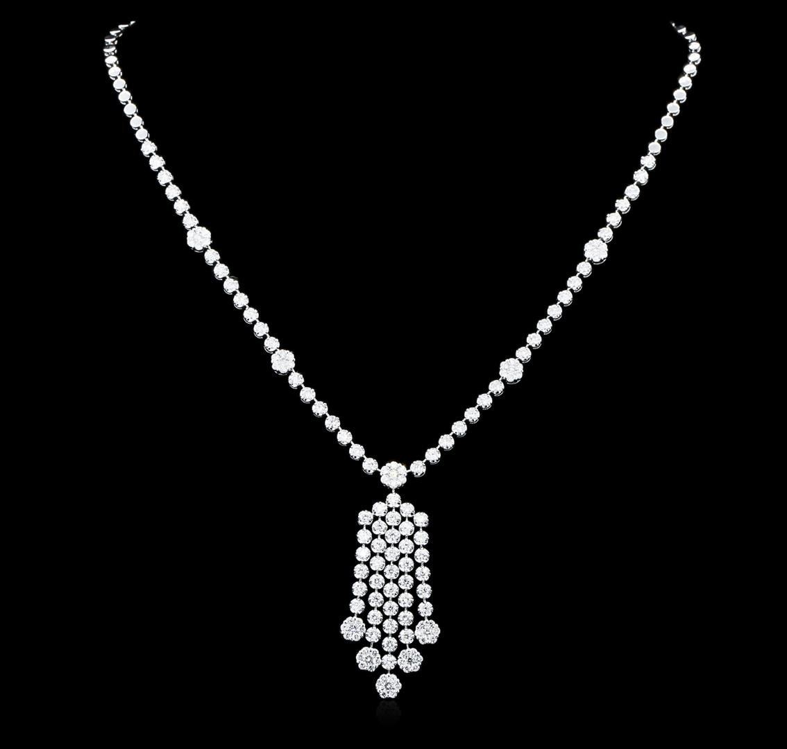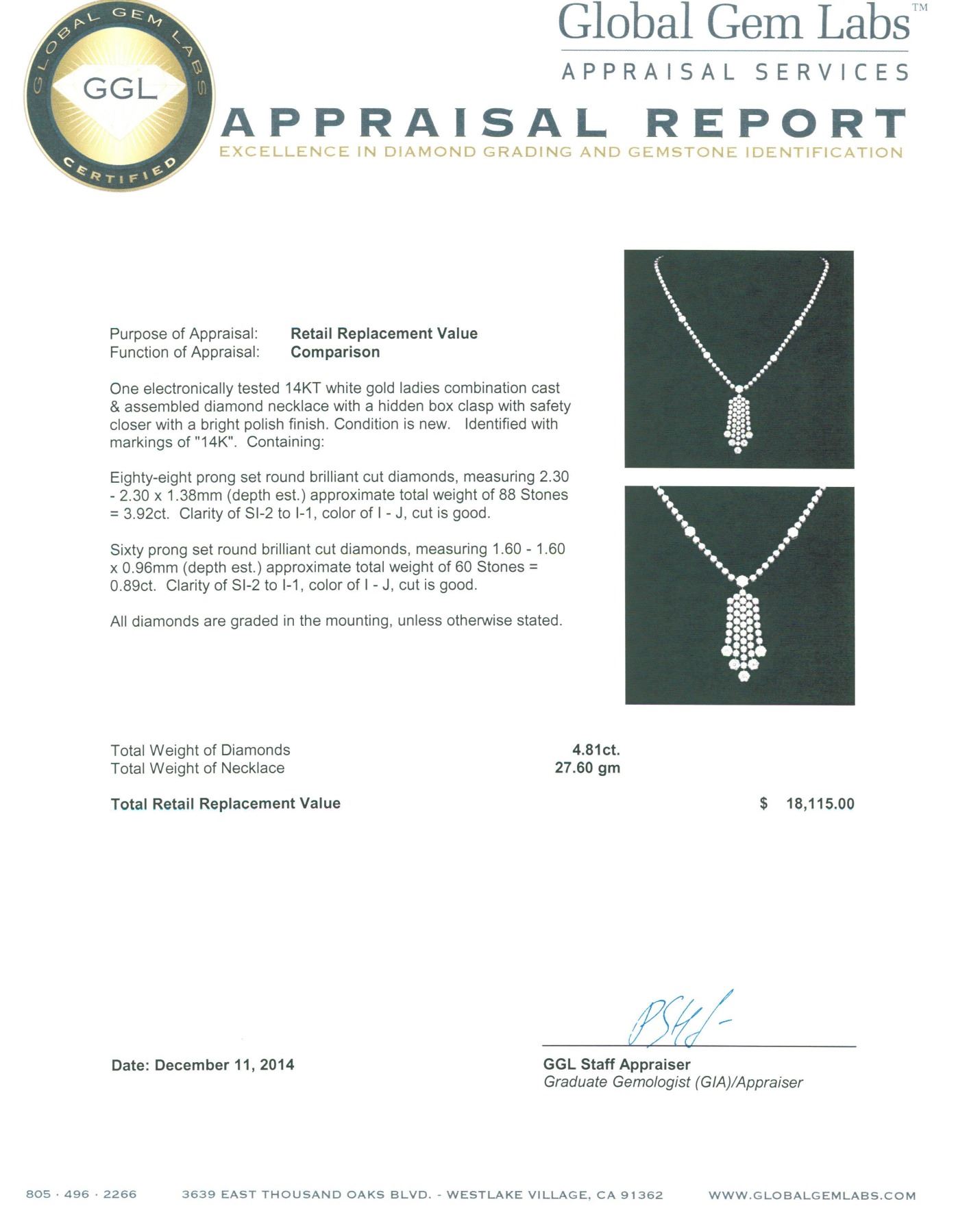 One electronically tested 14KT white gold ladies combination cast & assembled diamond necklace with a hidden box clasp with safety closer with a bright polish finish. Identified with markings of "14K". Condition is new. Containing: Eighty-Eight prong set round brilliant cut diamonds, measuring 2.30 - 2.30 x 1.38mm (depth est.) approximate total weight of 88 Stones = 3.92ct. Clarity: SI-2 to I-1. Color: I - J, Cut is Good. Sixty prong set round brilliant cut diamonds, measuring 1.60 - 1.60 x 0.96mm (depth est.) approximate total weight of 60 Stones = 0.89ct. Clarity: SI-2 to I-1. Color: I - J, Cut is Good. All diamonds are graded in the mounting, unless otherwise stated. Total Weight of Diamonds 4.81ct. Total Weight of Necklace 27.60 grams.