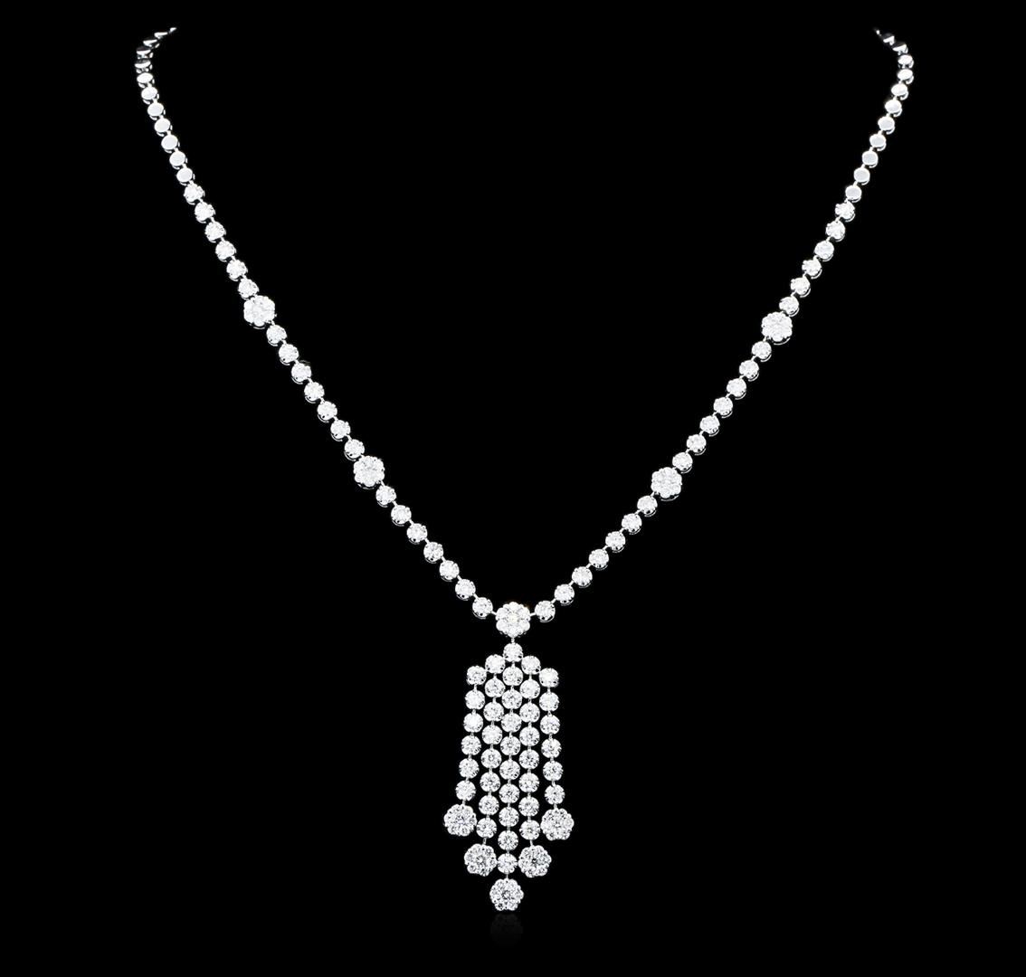 One electronically tested 14KT white gold ladies combination cast & assembled diamond necklace with a hidden box clasp with safety closer with a bright polish finish. Identified with markings of "14K". Condition is new. Containing: Eighty-Eight prong set round brilliant cut diamonds, measuring 2.30 - 2.30 x 1.38mm (depth est.) approximate total weight of 88 Stones = 3.92ct. Clarity: SI-2 to I-1. Color: I - J, Cut is Good. Sixty prong set round brilliant cut diamonds, measuring 1.60 - 1.60 x 0.96mm (depth est.) approximate total weight of 60 Stones = 0.89ct. Clarity: SI-2 to I-1. Color: I - J, Cut is Good. All diamonds are graded in the mounting, unless otherwise stated. Total Weight of Diamonds 4.81ct. Total Weight of Necklace 27.60 grams.