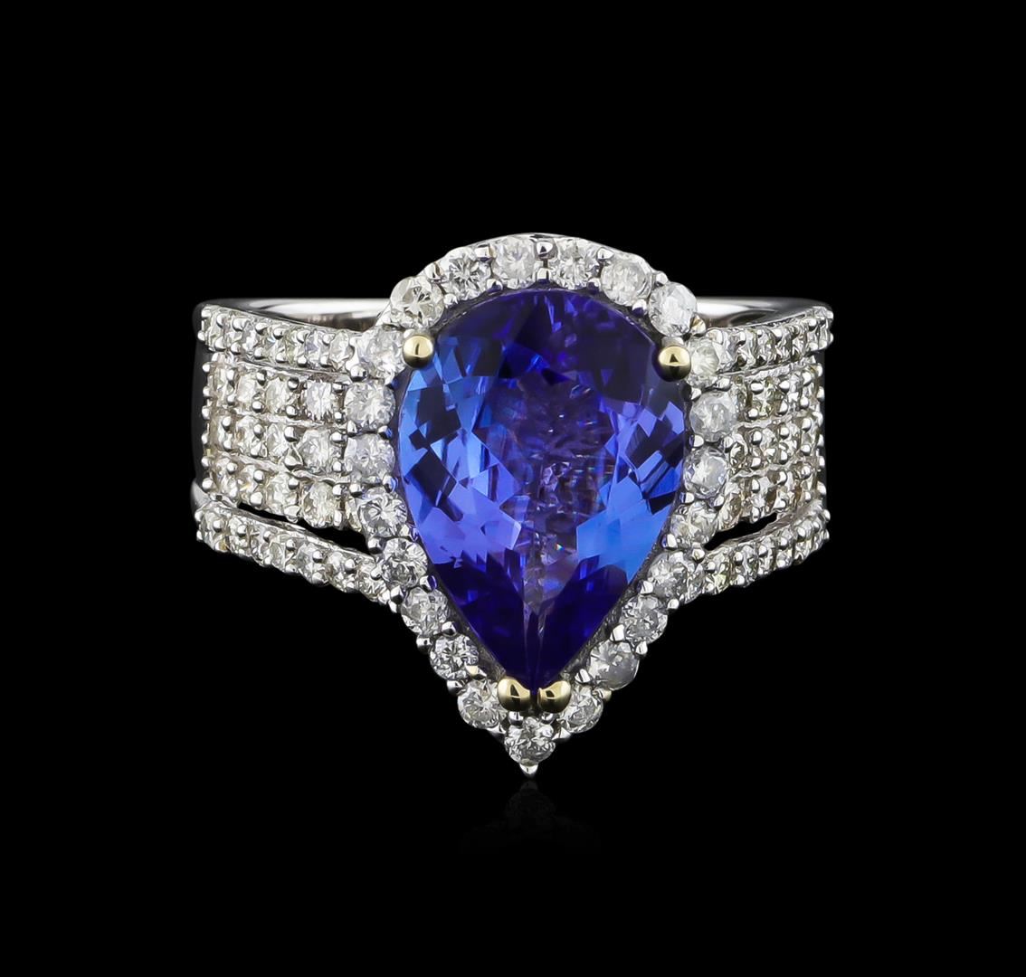 One electronically tested 14KT white gold ladies combination cast & assembled tanzanite and diamond ring with a split shank with a bright polish finish. Identified with markings of "14K". Condition is new. Containing: One prong set pear modified brilliant cut natural tanzanite, measuring 13.50 x 9.04 x 5.88mm, approximate weight of 4.81ct., clarity is eye clean, type I, medium, very slightly grayish, violet color, (GIA V 5/3), cut is good. One Hundred Twelve prong set round brilliant cut diamonds, measuring 1.50 - 1.10 x 0.78mm (depth est.) approximate total weight of 112 Stones = 0.90ct. Clarity: SI-1 to I-1. Color: J, Cut is Good. Colored gemstones are presumed to have been subjected to commonly used enhancement processes. All diamonds and colored gemstones are graded in the mounting, unless otherwise stated. Total Weight of Colored Stones 4.81ct. Total Weight of Diamonds 0.90ct. Total Weight of Ring 7.90 grams. GGL Appraised at $11,525.00.