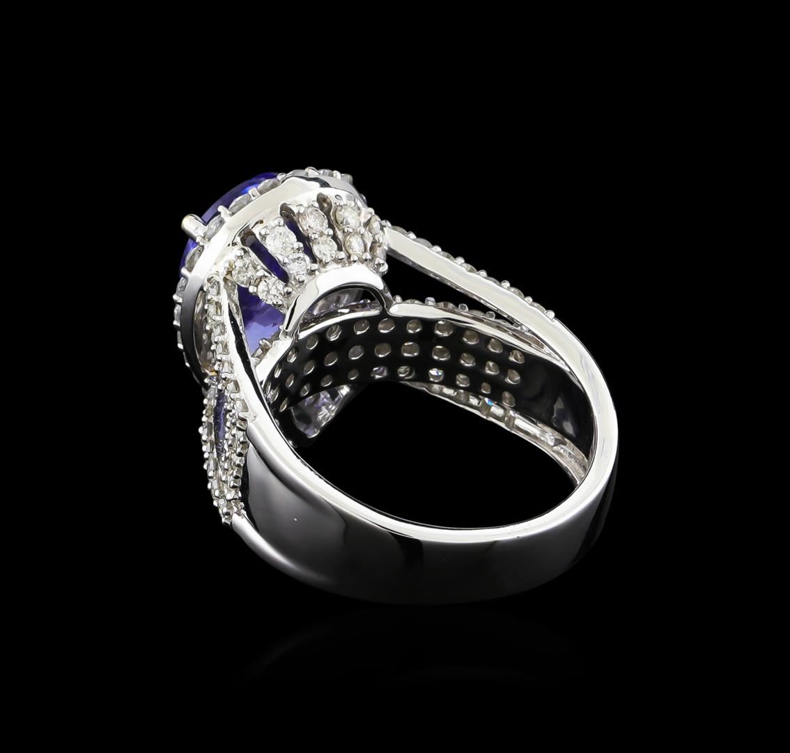 One electronically tested 14KT white gold ladies combination cast & assembled tanzanite and diamond ring with a split shank with a bright polish finish. Identified with markings of "14K". Condition is new. Containing: One prong set pear modified brilliant cut natural tanzanite, measuring 13.50 x 9.04 x 5.88mm, approximate weight of 4.81ct., clarity is eye clean, type I, medium, very slightly grayish, violet color, (GIA V 5/3), cut is good. One Hundred Twelve prong set round brilliant cut diamonds, measuring 1.50 - 1.10 x 0.78mm (depth est.) approximate total weight of 112 Stones = 0.90ct. Clarity: SI-1 to I-1. Color: J, Cut is Good. Colored gemstones are presumed to have been subjected to commonly used enhancement processes. All diamonds and colored gemstones are graded in the mounting, unless otherwise stated. Total Weight of Colored Stones 4.81ct. Total Weight of Diamonds 0.90ct. Total Weight of Ring 7.90 grams. GGL Appraised at $11,525.00.