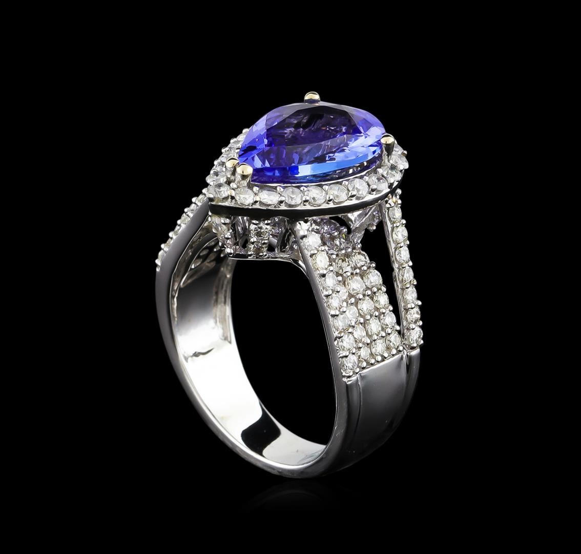 One electronically tested 14KT white gold ladies combination cast & assembled tanzanite and diamond ring with a split shank with a bright polish finish. Identified with markings of "14K". Condition is new. Containing: One prong set pear modified brilliant cut natural tanzanite, measuring 13.50 x 9.04 x 5.88mm, approximate weight of 4.81ct., clarity is eye clean, type I, medium, very slightly grayish, violet color, (GIA V 5/3), cut is good. One Hundred Twelve prong set round brilliant cut diamonds, measuring 1.50 - 1.10 x 0.78mm (depth est.) approximate total weight of 112 Stones = 0.90ct. Clarity: SI-1 to I-1. Color: J, Cut is Good. Colored gemstones are presumed to have been subjected to commonly used enhancement processes. All diamonds and colored gemstones are graded in the mounting, unless otherwise stated. Total Weight of Colored Stones 4.81ct. Total Weight of Diamonds 0.90ct. Total Weight of Ring 7.90 grams. GGL Appraised at $11,525.00.