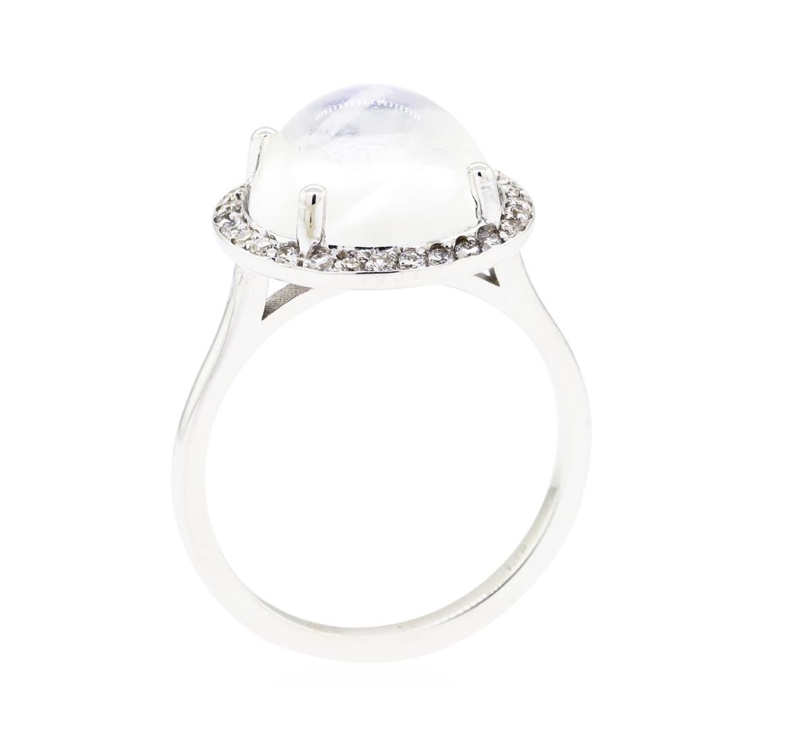 One ring featuring: 14KT white gold weighing 4.1 grams containing one cabochon moonstone weighing 4.82ct and diamonds weighing 0.26ctw. The ring is a size 6.5.