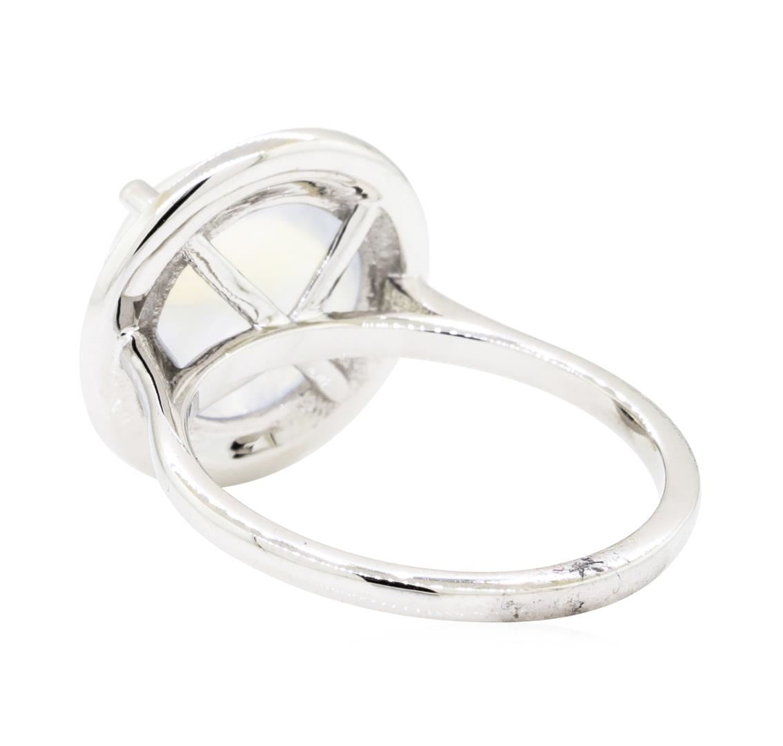 One ring featuring: 14KT white gold weighing 4.1 grams containing one cabochon moonstone weighing 4.82ct and diamonds weighing 0.26ctw. The ring is a size 6.5.