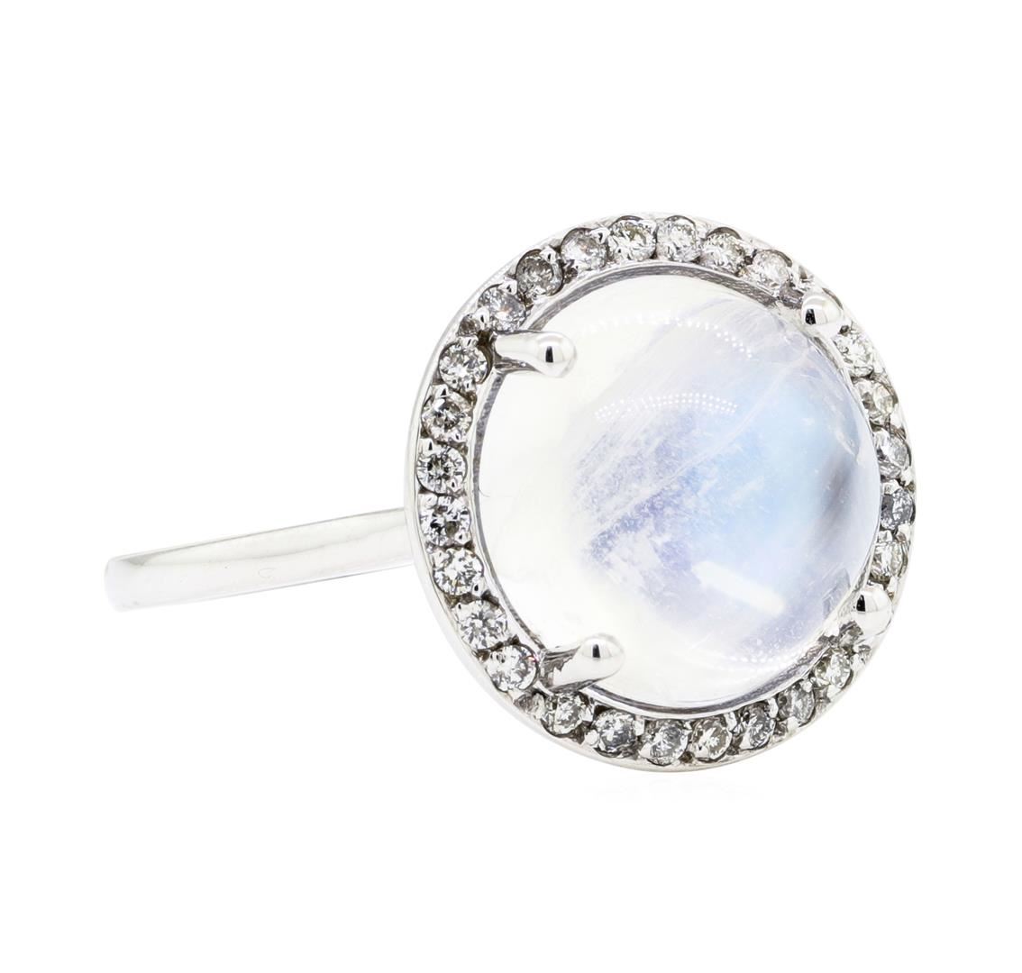 One ring featuring: 14KT white gold weighing 4.1 grams containing one cabochon moonstone weighing 4.82ct and diamonds weighing 0.26ctw. The ring is a size 6.5.