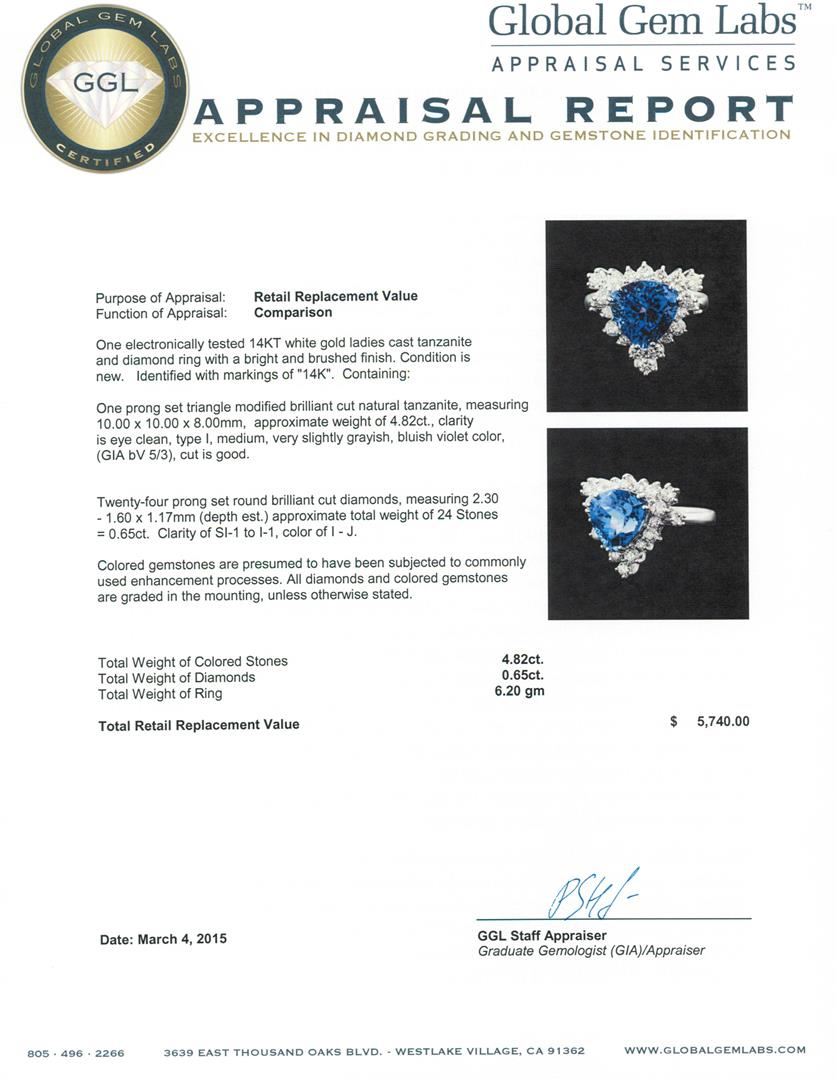 One electronically tested 14KT white gold ladies cast tanzanite and diamond ring with a bright and brushed finish. Identified with markings of "14K". Condition is new. Containing: One prong set triangle modified brilliant cut natural tanzanite, measuring 10.00. x 10.00. x 8.00.mm, approximate weight of 4.82ct., clarity is eye clean, type I, medium, very slightly grayish, bluish violet color, (GIA bV 5/3), cut is good. Twenty-Four prong set round brilliant cut diamonds, measuring 2.30 - 1.60 x 1.17mm (depth est.) approximate total weight of 24 Stones = 0.65ct. Clarity: SI-1 to I-1. Color: I - J. Colored gemstones are presumed to have been subjected to commonly used enhancement processes. All diamonds and colored gemstones are graded in the mounting, unless otherwise stated. Total Weight of Colored Stones 4.82ct. Total Weight of Diamonds 0.65ct. Total Weight of Ring 6.20 grams. GGL Appraised at $5,740.00.