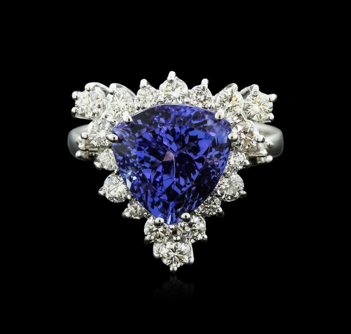 One electronically tested 14KT white gold ladies cast tanzanite and diamond ring with a bright and brushed finish. Identified with markings of "14K". Condition is new. Containing: One prong set triangle modified brilliant cut natural tanzanite, measuring 10.00. x 10.00. x 8.00.mm, approximate weight of 4.82ct., clarity is eye clean, type I, medium, very slightly grayish, bluish violet color, (GIA bV 5/3), cut is good. Twenty-Four prong set round brilliant cut diamonds, measuring 2.30 - 1.60 x 1.17mm (depth est.) approximate total weight of 24 Stones = 0.65ct. Clarity: SI-1 to I-1. Color: I - J. Colored gemstones are presumed to have been subjected to commonly used enhancement processes. All diamonds and colored gemstones are graded in the mounting, unless otherwise stated. Total Weight of Colored Stones 4.82ct. Total Weight of Diamonds 0.65ct. Total Weight of Ring 6.20 grams. GGL Appraised at $5,740.00.