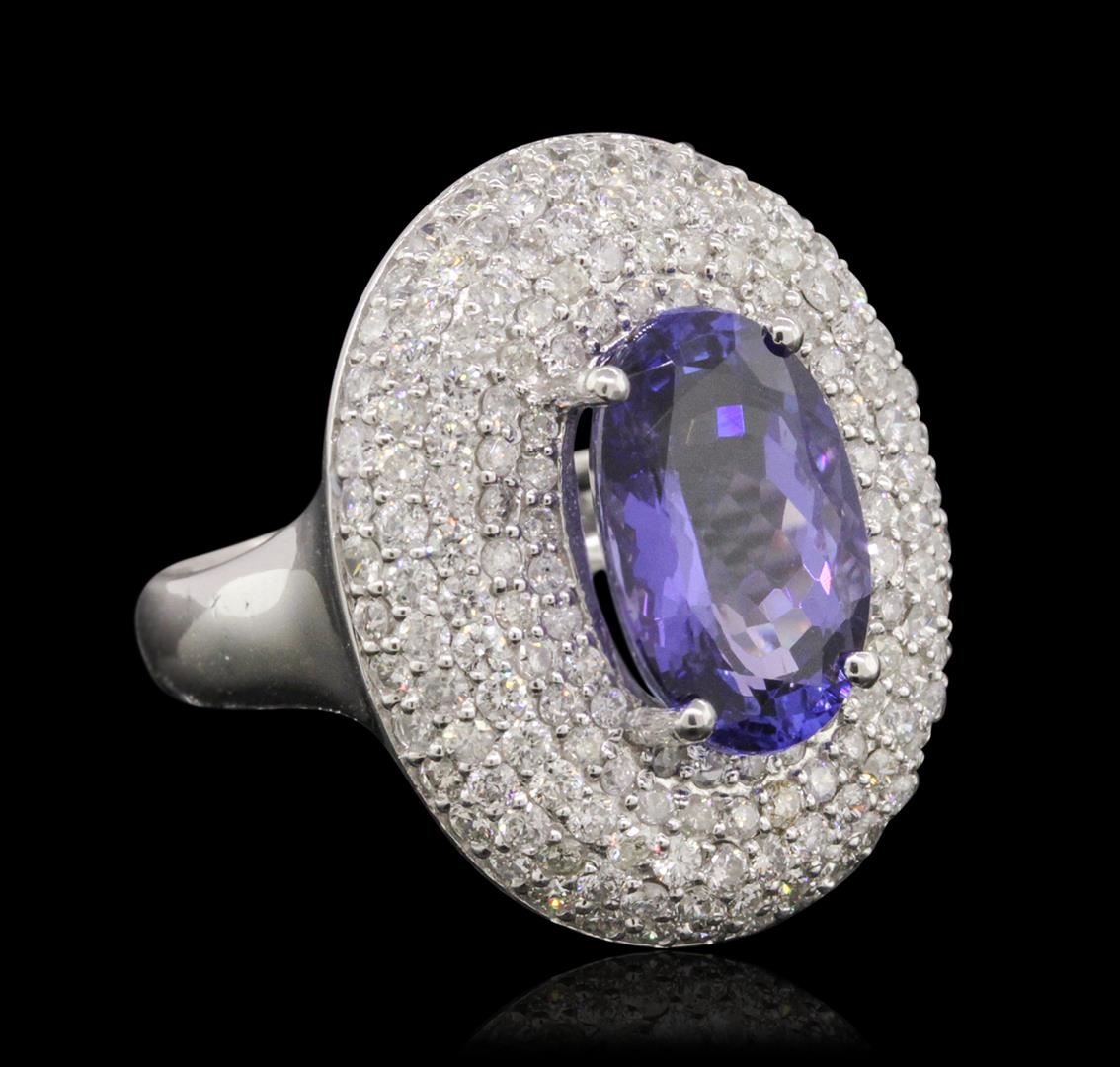 One electronically tested 14KT white gold ladies combination cast & assembled ring with a bright polish finish. Condition is new. Identified with markings of "K14". Containing: One prong set oval modified brilliant cut natural tanzanite, measuring 13.10 x 8.65 x 6.11mm, approximate weight of 4.84ct., clarity is eye clean, type I, medium, moderately strong, bluish violet color, (GIA bV 5/4), cut is good. Two Hundred Forty-Six prong set round brilliant cut diamonds, measuring 1.30 - 1.30 x 0.78mm (depth est.) approximate. Total Weight of 246 Stones = 1.97ct. Clarity: I-1 to I-2. Color: I - J, Cut is Good. Colored gemstones are presumed to have been subjected to commonly used enhancement processes. All diamonds and colored gemstones are graded in the mounting, unless otherwise stated. Total Weight of Colored Stones 4.84ct. Total Weight of Diamonds 1.97ct. Total Weight of Ring 8.50 grams. GGL Appraised at $11,965.00.
