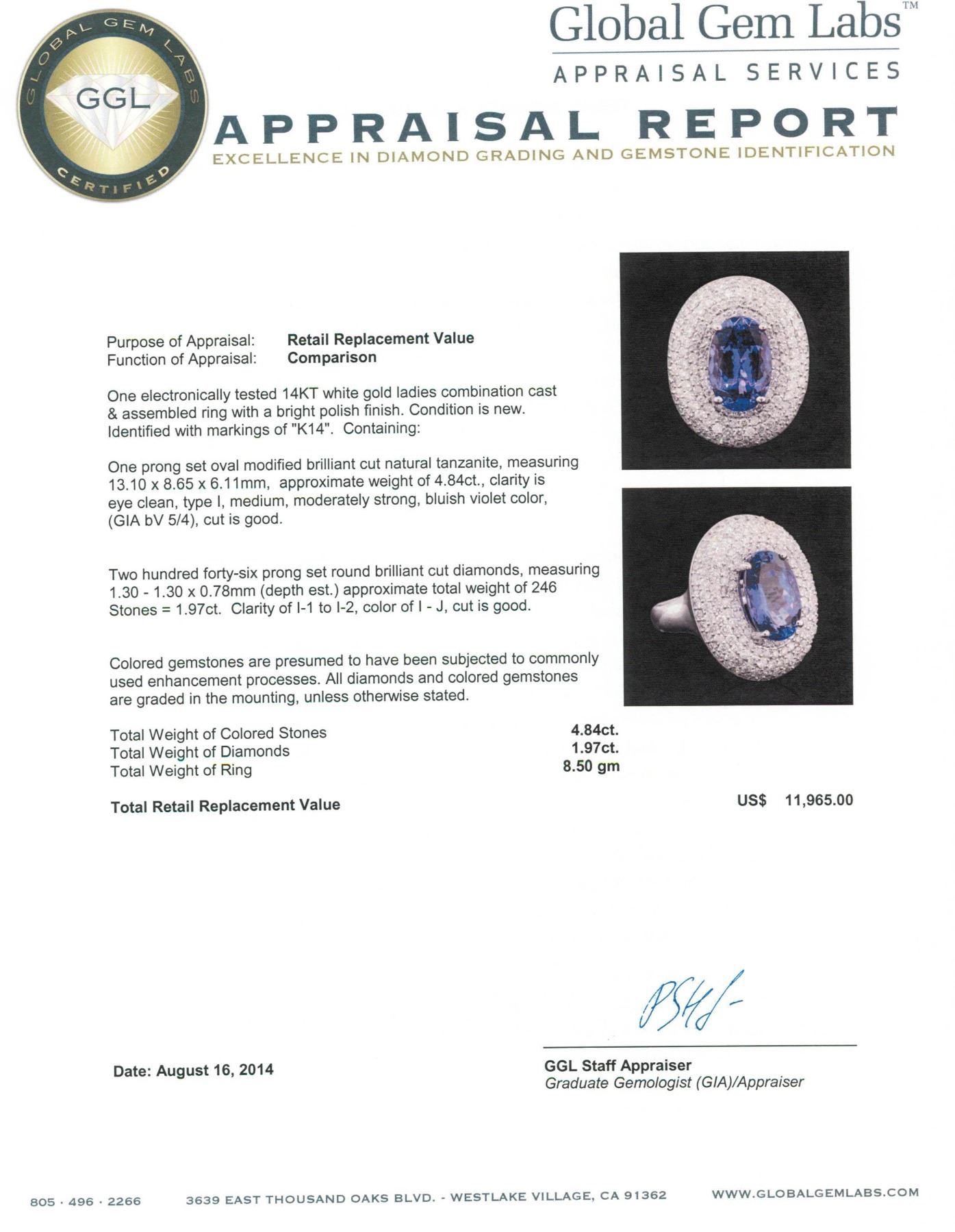 One electronically tested 14KT white gold ladies combination cast & assembled ring with a bright polish finish. Condition is new. Identified with markings of "K14". Containing: One prong set oval modified brilliant cut natural tanzanite, measuring 13.10 x 8.65 x 6.11mm, approximate weight of 4.84ct., clarity is eye clean, type I, medium, moderately strong, bluish violet color, (GIA bV 5/4), cut is good. Two Hundred Forty-Six prong set round brilliant cut diamonds, measuring 1.30 - 1.30 x 0.78mm (depth est.) approximate. Total Weight of 246 Stones = 1.97ct. Clarity: I-1 to I-2. Color: I - J, Cut is Good. Colored gemstones are presumed to have been subjected to commonly used enhancement processes. All diamonds and colored gemstones are graded in the mounting, unless otherwise stated. Total Weight of Colored Stones 4.84ct. Total Weight of Diamonds 1.97ct. Total Weight of Ring 8.50 grams. GGL Appraised.