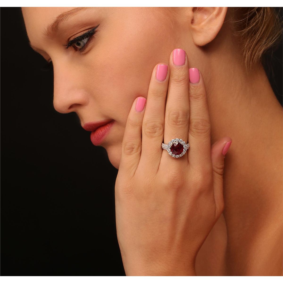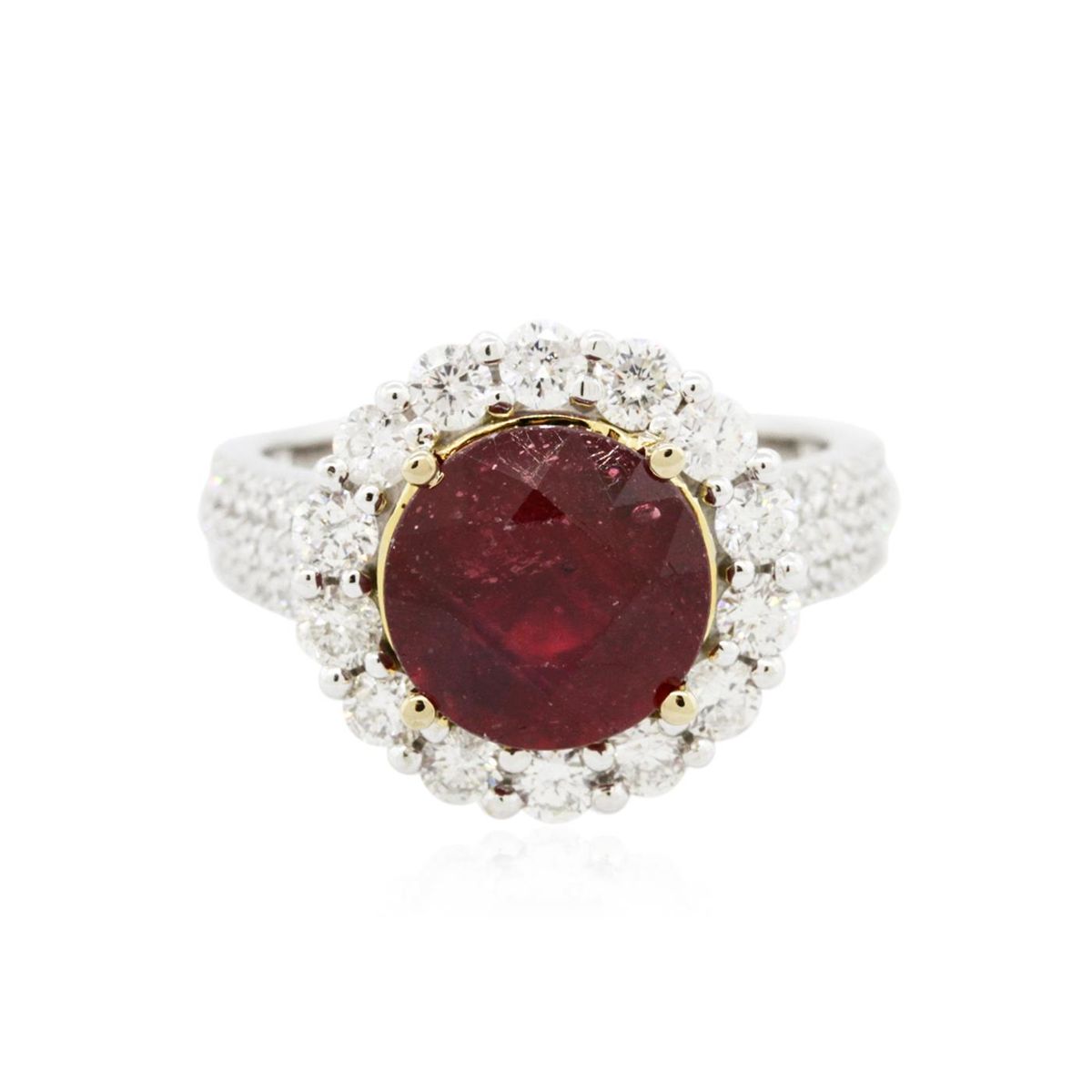 One electronically tested 14KT white gold ladies cast ruby and diamond ring with a bright polish finish. Condition is new, good workmanship. The featured ruby is set within a diamond bezel supported by diamond set shoulders, completed by a two and one-half millimeter wide band. Identified with markings of "14K". Containing: One prong set round mixed cut natural ruby, measuring 9.50 - 9.45 x 5.80 mm, 15%. bulge factor, approximate weight of 4.85ct., clarity is heavily included, type II, dark, very slightly brownish, slightly purplish red color, (GIA slpR 7/3), cut is good. Transmitting light somewhat diffusely, transparent to translucent. Naturally occurring internal & external characteristics are present. Indications of laboratory high temperature heat treatment, with glass & flux additives. Graded in the setting. Ruby has a low tolerance to rhodium plating, repolishing the surface, & ultrasonic cleaning. Sixty-Two prong set round brilliant cut diamonds, measuring 2.70 - 1.20 x 1.17mm (depth est.) approximate. Total Weight of 62 Stones = 1.37ct. Graded in the setting. Clarity: SI-1 to I-1. Color: G - I. Total Weight of Colored Stones 4.85ct. Total Weight of Diamonds 1.37ct. Total Weight of Ring 6.38grams. AIG Appraised at $6,325.00.