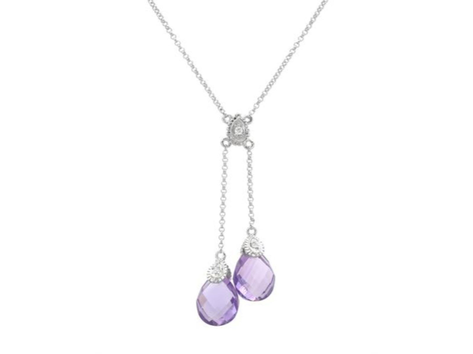 One 14KT White Gold 4.85ctw Amethyst and Diamond Pendant with Chain. (2) Amethyst stones with a total weight of 4.85cts. (5) round Diamonds with a total weight of 0.06cts with a color of I and clarity of I-1. Total weight of this pendant with chain is 2.64 grams.