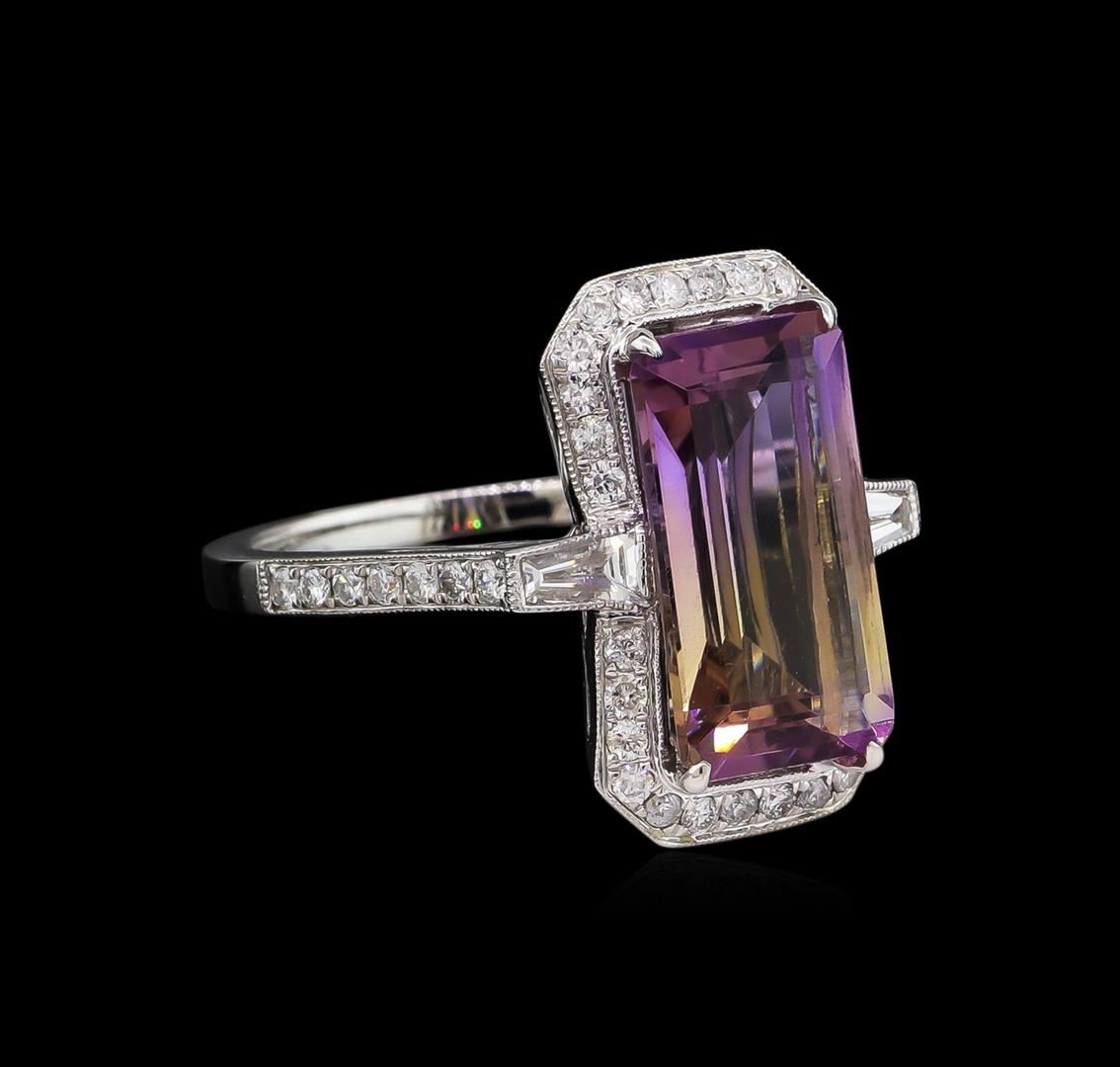 One electronically tested 14KT white gold ladies cast ametrine and diamond ring. Condition is new, good workmanship. The featured ametrine is set within a diamond bezel supported by diamond set shoulders, completed by a one and one-half millimeter wide band. Bright polish finish with milgrain detailing. Identified with markings of "14K 585". Containing: One prong set rectangular step cut natural ametrine quartz, measuring 13.60 x 7.50 x 5.60mm, 5%. bulge factor, approximate weight of 4.89ct., clarity is eye clean, type I, medium, very slightly grayish, purple color, (GIA P 5/3) to medium light, brownish, orangy yellow, (GIA oY 4/3), cut is good. Transmitting light with no distortion, transparent. Graded in the setting. Two bezel set baguette cut (tapered) diamonds, measuring from 4.00 x 1.80 x 1.26mm (depth est.) to 4.10 x 1.90 x 1.33mm (depth est.) approximate. Total Weight of 2 Stones = 0.18ct. Graded in the setting. Clarity: VVS-2 to VS-1. Color: G Forty-Two bead set round brilliant cut diamonds, measuring 1.30 - 1.30 x 0.78mm (depth est.) approximate. Total Weight of 42 Stones = 0.44ct. Graded in the setting. Clarity: SI-1 to I-1. Color: G - I. Total Weight of Colored Stones 4.89ct. Total Weight of Diamonds 0.62ct. Total Weight of Ring 4.86 grams. AIG Appraised at $3,230.00.