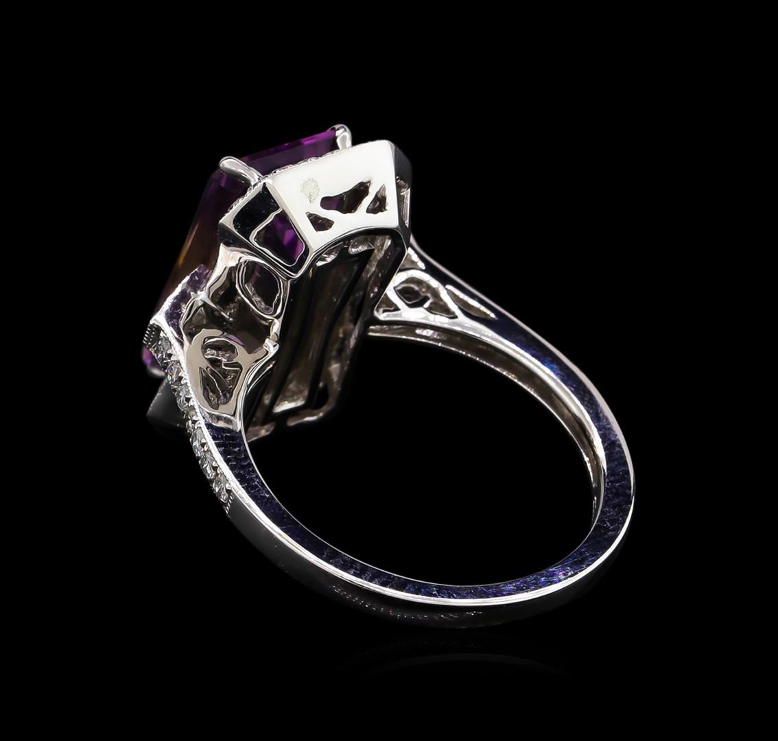 One electronically tested 14KT white gold ladies cast ametrine and diamond ring. Condition is new, good workmanship. The featured ametrine is set within a diamond bezel supported by diamond set shoulders, completed by a one and one-half millimeter wide band. Bright polish finish with milgrain detailing. Identified with markings of "14K 585". Containing: One prong set rectangular step cut natural ametrine quartz, measuring 13.60 x 7.50 x 5.60mm, 5%. bulge factor, approximate weight of 4.89ct., clarity is eye clean, type I, medium, very slightly grayish, purple color, (GIA P 5/3) to medium light, brownish, orangy yellow, (GIA oY 4/3), cut is good. Transmitting light with no distortion, transparent. Graded in the setting. Two bezel set baguette cut (tapered) diamonds, measuring from 4.00 x 1.80 x 1.26mm (depth est.) to 4.10 x 1.90 x 1.33mm (depth est.) approximate. Total Weight of 2 Stones = 0.18ct. Graded in the setting. Clarity: VVS-2 to VS-1. Color: G Forty-Two bead set round brilliant cut diamonds, measuring 1.30 - 1.30 x 0.78mm (depth est.) approximate. Total Weight of 42 Stones = 0.44ct. Graded in the setting. Clarity: SI-1 to I-1. Color: G - I. Total Weight of Colored Stones 4.89ct. Total Weight of Diamonds 0.62ct. Total Weight of Ring 4.86 grams. AIG Appraised at $3,230.00.