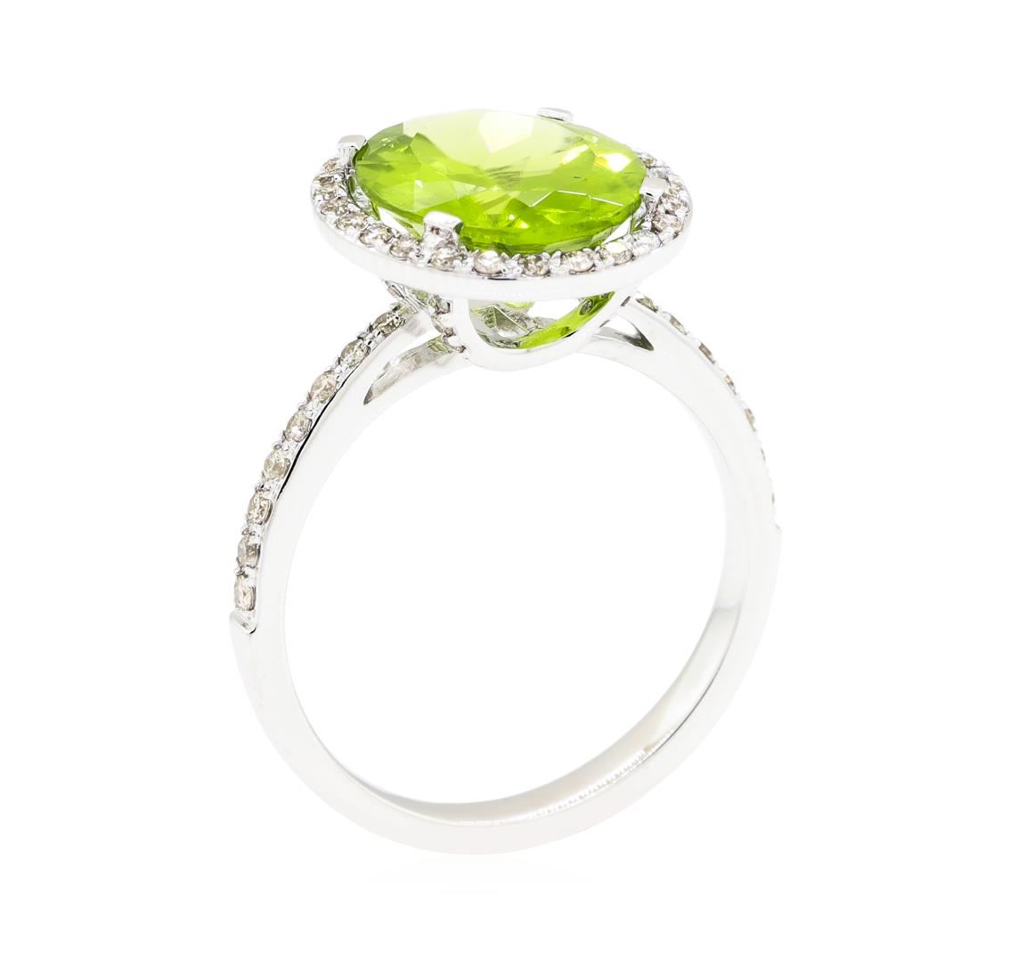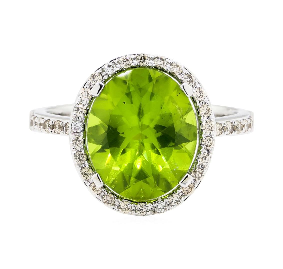 One ring featuring: 14KT white gold weighing 4.0 grams containing one oval peridot weighing 4.90ct and diamonds weighing 0.25ctw. The ring is a size 7.5.