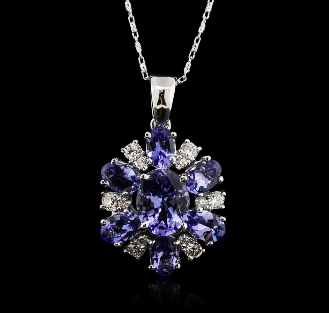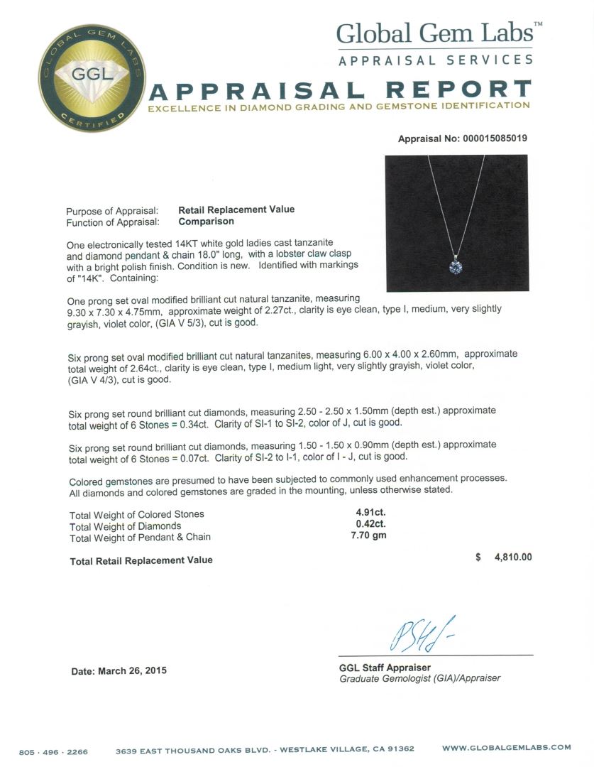 One electronically tested 14KT white gold ladies cast tanzanite and diamond pendant & chain 18.0" long, with a lobster claw clasp with a bright polish finish. Identified with markings of "14K". Condition is new. Containing: One prong set oval modified brilliant cut natural tanzanite, measuring 9.30 x 7.30 x 4.75mm, approximate weight of 2.27ct., clarity is eye clean, type I, medium, very slightly grayish, violet color, (GIA V 5/3), cut is good. Six prong set oval modified brilliant cut natural tanzanites, measuring 6.00 x 4.00 x 2.60mm, approximate total weight of 2.64ct., clarity is eye clean, type I, medium light, very slightly grayish, violet color, (GIA V 4/3), cut is good. Six prong set round brilliant cut diamonds, measuring 2.50 - 2.50 x 1.50mm (depth est.) approximate total weight of 6 Stones = 0.34ct. Clarity: SI-1 to SI-2. Color: J, Cut is Good. Six prong set round brilliant cut diamonds, measuring 1.50 - 1.50 x 0.90mm (depth est.) approximate total weight of 6 Stones = 0.07ct. Clarity: SI-2 to I-1. Color: I - J, Cut is Good. Colored gemstones are presumed to have been subjected to commonly used enhancement processes. All diamonds and colored gemstones are graded in the mounting, unless otherwise stated. Total Weight of Colored Stones 4.91ct. Total Weight of Diamonds 0.42ct. Total Weight of Pendant & Chain 7.70 grams. GGL Appraised at $4,810.00.
