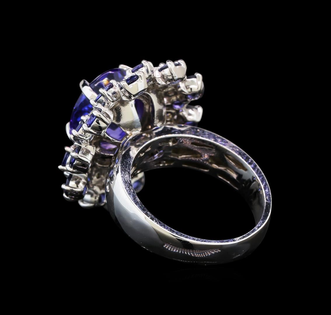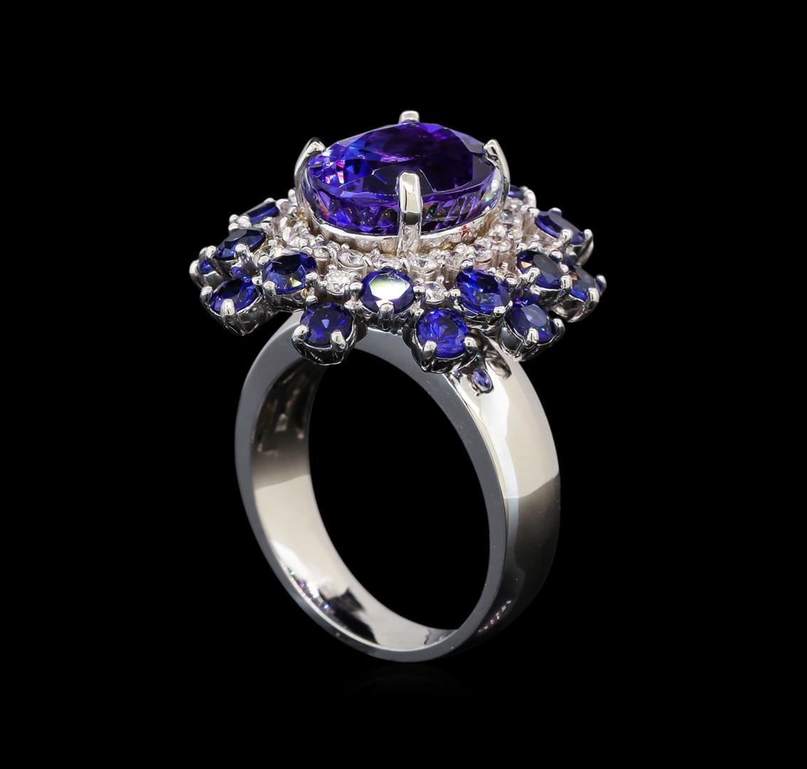 One electronically tested 14KT white gold ladies cast tanzanite, sapphire and diamond ring with a bright polish finish. Identified with markings of "K14". Condition is new. Containing: One prong set oval modified brilliant cut natural tanzanite, measuring 11.84 x 9.54 x 6.20mm, approximate weight of 4.93ct., clarity is eye clean, type I, light, very slightly grayish, violet color, (GIA V 3/3), cut is good. Twenty prong set round modified brilliant cut natural blue sapphires, measuring 3.00 - 2.50 x 1.79 mm, approximate. Total Weight of 2.60ct., clarity is eye clean, type II, medium, moderately strong, blue color, (GIA B 5/4), cut is good. Thirty prong set round brilliant cut diamonds, measuring 1.60 - 1.50 x 0.93mm (depth est.) approximate. Total Weight of 30 Stones = 0.41ct. Clarity: SI-2 to I-1. Color: H - I, Cut is Good. Colored gemstones are presumed to have been subjected to commonly used enhancement processes. All diamonds and colored gemstones are graded in the mounting, unless otherwise stated. Total Weight of Colored Stones 7.53ct. Total Weight of Diamonds 0.41ct. Total Weight of Ring 12.30 grams. GGL Appraised at $6,640.00.