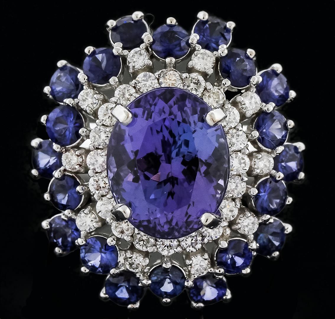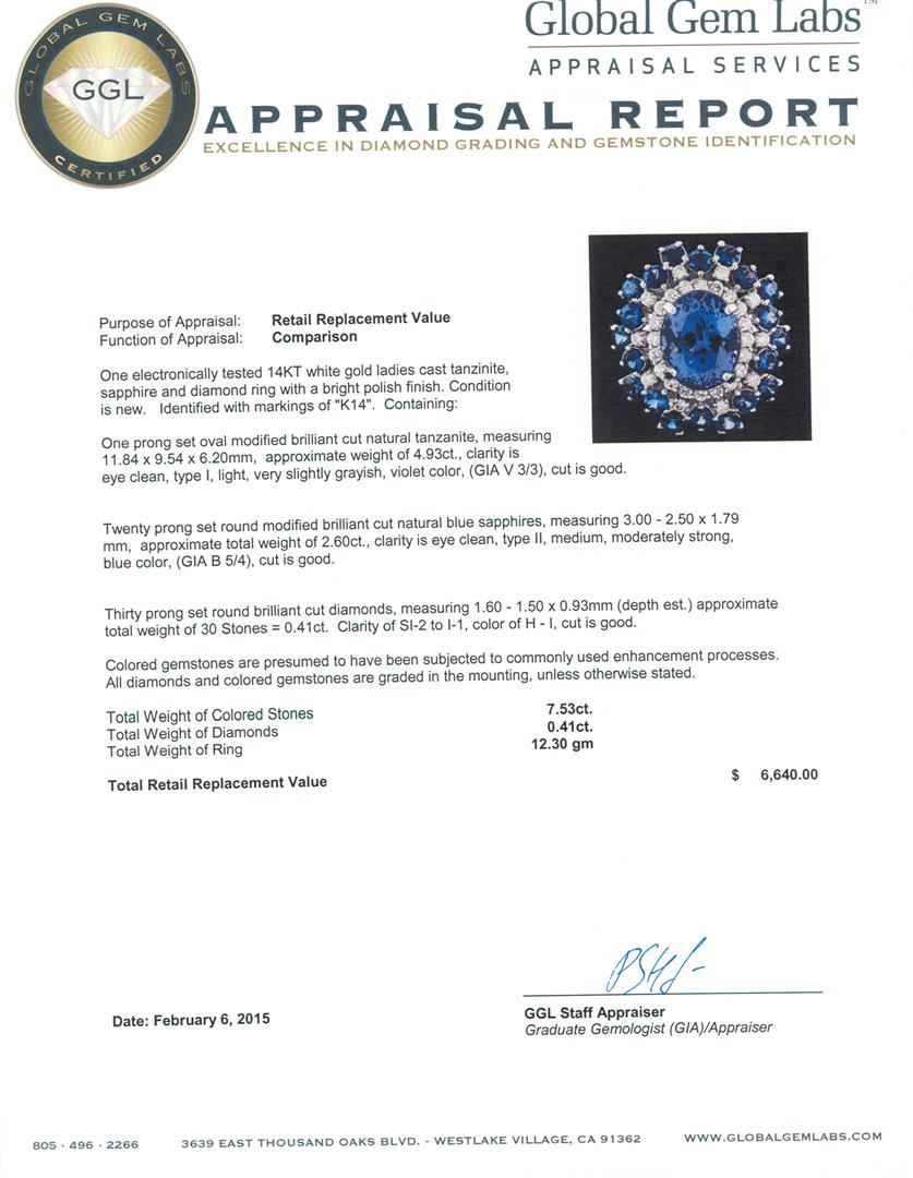 One electronically tested 14KT white gold ladies cast tanzanite, sapphire and diamond ring with a bright polish finish. Identified with markings of "K14". Condition is new. Containing: One prong set oval modified brilliant cut natural tanzanite, measuring 11.84 x 9.54 x 6.20mm, approximate weight of 4.93ct., clarity is eye clean, type I, light, very slightly grayish, violet color, (GIA V 3/3), cut is good. Twenty prong set round modified brilliant cut natural blue sapphires, measuring 3.00 - 2.50 x 1.79 mm, approximate. Total Weight of 2.60ct., clarity is eye clean, type II, medium, moderately strong, blue color, (GIA B 5/4), cut is good. Thirty prong set round brilliant cut diamonds, measuring 1.60 - 1.50 x 0.93mm (depth est.) approximate. Total Weight of 30 Stones = 0.41ct. Clarity: SI-2 to I-1. Color: H - I, Cut is Good. Colored gemstones are presumed to have been subjected to commonly used enhancement processes. All diamonds and colored gemstones are graded in the mounting, unless otherwise stated. Total Weight of Colored Stones 7.53ct. Total Weight of Diamonds 0.41ct. Total Weight of Ring 12.30 grams. GGL Appraised at $6,640.00.