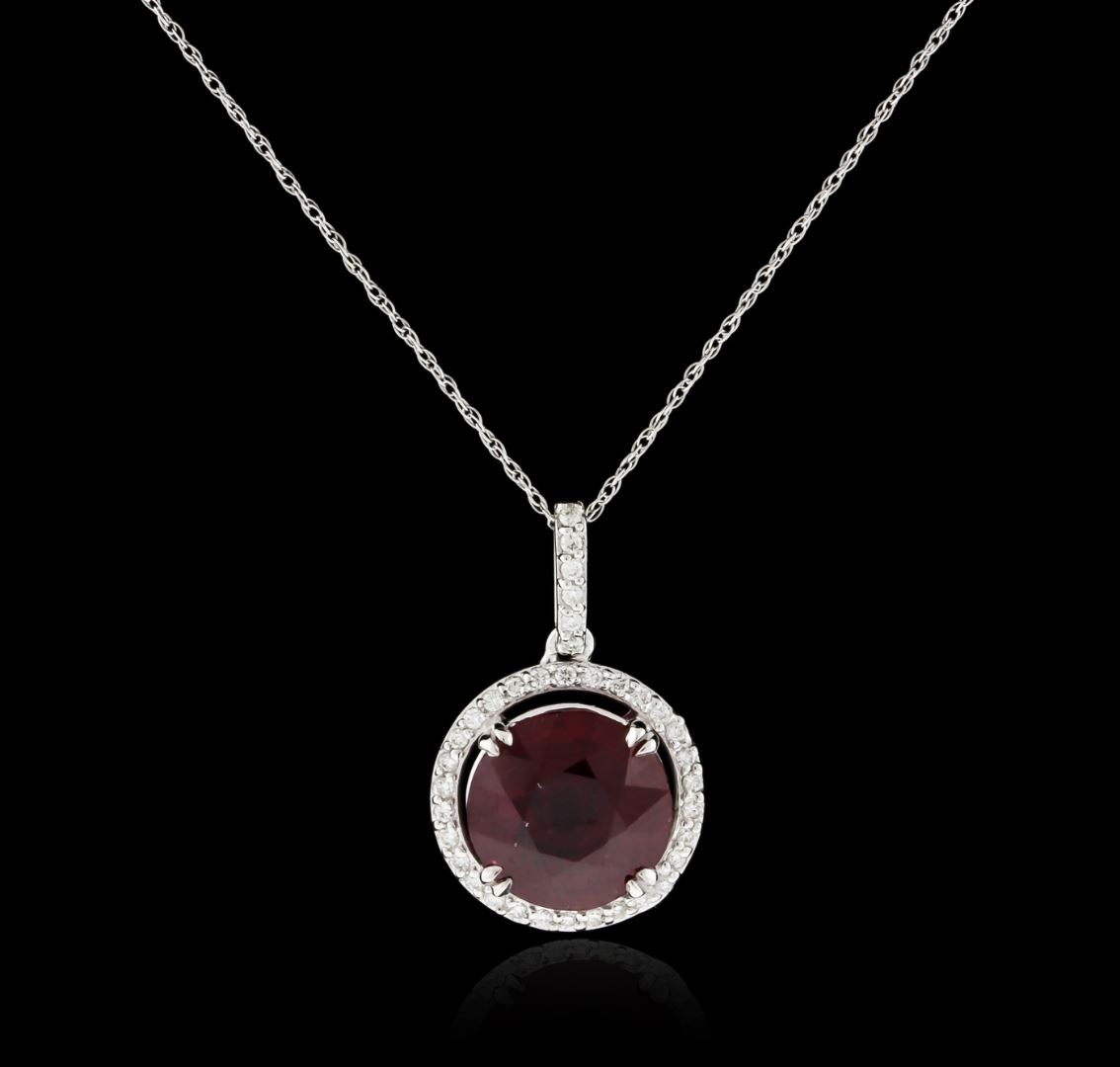 One pendant with chain featuring: 14KT white gold weighing 3.62 grams containing one round cut ruby center weighing 4.94ct and round cut diamonds weighing a total of 0.18ct.