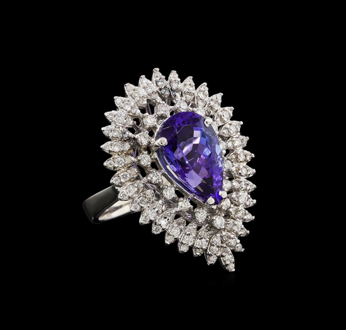 One electronically tested 14KT white gold ladies cast tanzanite and diamond ring with a bright polish finish. Identified with markings of "K14". Condition is new. Containing: One prong set pear modified brilliant cut natural tanzanite, measuring 13.60 x 8.60 x 6.33mm, approximate weight of 4.96ct., clarity is eye clean, type I, medium light, very slightly grayish, violet color, (GIA V 4/3), cut is good. One Hundred Two prong set round brilliant cut diamonds, measuring 1.50 - 1.30 x 0.84mm (depth est.) approximate total weight of 102 Stones = 1.02ct. Clarity: SI-2 to I-2. Color: J, Cut is Good. Colored gemstones are presumed to have been subjected to commonly used enhancement processes. All diamonds and colored gemstones are graded in the mounting, unless otherwise stated. Total Weight of Colored Stones 4.96ct. Total Weight of Diamonds 1.02ct. Total Weight of Ring 9.10 grams. GGL Appraised at $6,625.00.
