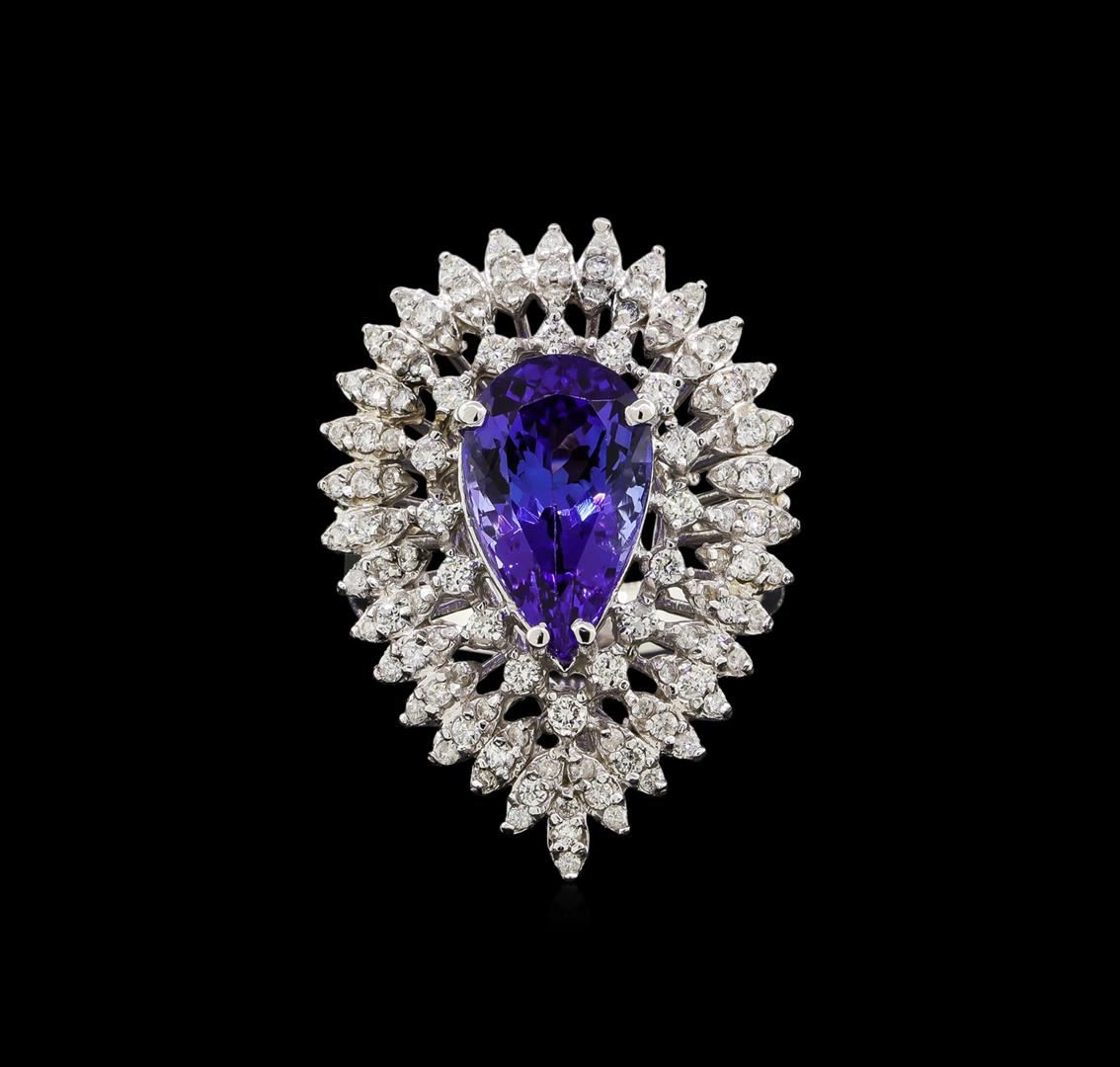 One electronically tested 14KT white gold ladies cast tanzanite and diamond ring with a bright polish finish. Identified with markings of "K14". Condition is new. Containing: One prong set pear modified brilliant cut natural tanzanite, measuring 13.60 x 8.60 x 6.33mm, approximate weight of 4.96ct., clarity is eye clean, type I, medium light, very slightly grayish, violet color, (GIA V 4/3), cut is good. One Hundred Two prong set round brilliant cut diamonds, measuring 1.50 - 1.30 x 0.84mm (depth est.) approximate total weight of 102 Stones = 1.02ct. Clarity: SI-2 to I-2. Color: J, Cut is Good. Colored gemstones are presumed to have been subjected to commonly used enhancement processes. All diamonds and colored gemstones are graded in the mounting, unless otherwise stated. Total Weight of Colored Stones 4.96ct. Total Weight of Diamonds 1.02ct. Total Weight of Ring 9.10 grams. GGL Appraised at $6,625.00.