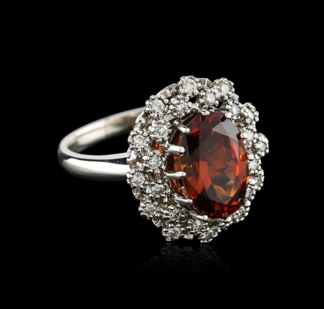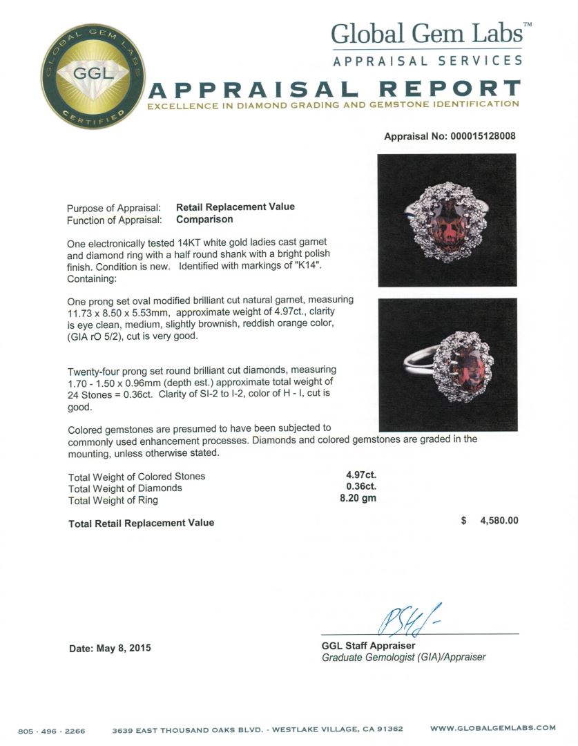 One electronically tested 14KT white gold ladies cast garnet and diamond ring with a half round shank with a bright polish finish. Identified with markings of "K14". Condition is new. Containing: One prong set oval modified brilliant cut natural garnet, measuring 11.73 x 8.50 x 5.53mm, approximate weight of 4.97ct., clarity is eye clean, medium, slightly brownish, reddish orange color, (GIA rO 5/2), cut is very good. Twenty-Four prong set round brilliant cut diamonds, measuring 1.70 - 1.50 x 0.96mm (depth est.) approximate total weight of 24 Stones = 0.36ct. Clarity: SI-2 to I-2. Color: H - I, Cut is Good. Colored gemstones are presumed to have been subjected to commonly used enhancement processes. Diamonds and colored gemstones are graded in the mounting, unless otherwise stated. Total Weight of Colored Stones 4.97ct. Total Weight of Diamonds 0.36ct. Total Weight of Ring 8.20 grams. GGL Appraised at $4,580.00.