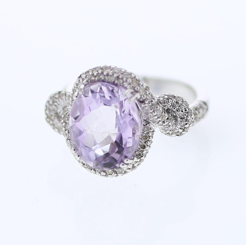 One 14KT White Gold 4.98ct Amethyst and Diamond Ring. (1) Amethyst stone with a total weight of 4.98cts. (16) Diamonds with a total weight of 0.89cts. Total weight of this ring is 5.36 grams.