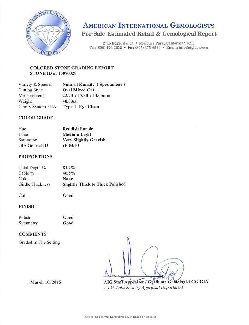 One electronically tested 14KT white gold ladies cast & assembled kunzite and diamond pendant with chain. The pendant features a kunzite set within a stylized diamond frame, completed by a diamond set bail. The pendant is supported by an eighteen inch length 14KT white gold designer style chain, terminating in a lobster claw clasp. Bright polish finish. Identified with markings of "K14". Condition is new, good workmanship. Containing: One prong set oval mixed cut natural kunzite, measuring 22.70 x 17.30 x 14.05mm, 12% bulge factor, approximate weight of 40.03ct., clarity is eye clean, type I, medium light, very slightly grayish, reddish purple color, (GIA rP 4/3), cut is good. Transmitting light with no distortion, transparent. Colored Stone Grading Report attached. Graded in the setting. Sixty-Six prong and bezel set round brilliant cut diamonds, measuring 2.50 - 2.00 x 1.35mm (depth est.) approximate total weight of 66 Stones = 2.84ct. Graded in the setting. Clarity: VS-2 to SI-1. Color: H - J. Total Weight of Colored Stones 40.03ct. Total Weight of Diamonds 2.84ct. Total Weight of Pendant With Chain 30.71 grams. AIG Appraised.
