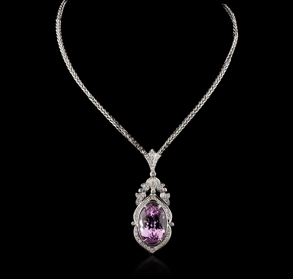 One electronically tested 14KT white gold ladies cast & assembled kunzite and diamond pendant with chain. The pendant features a kunzite set within a stylized diamond frame, completed by a diamond set bail. The pendant is supported by an eighteen inch length 14KT white gold designer style chain, terminating in a lobster claw clasp. Bright polish finish. Identified with markings of "K14". Condition is new, good workmanship. Containing: One prong set oval mixed cut natural kunzite, measuring 22.70 x 17.30 x 14.05mm, 12% bulge factor, approximate weight of 40.03ct., clarity is eye clean, type I, medium light, very slightly grayish, reddish purple color, (GIA rP 4/3), cut is good. Transmitting light with no distortion, transparent. Colored Stone Grading Report attached. Graded in the setting. Sixty-Six prong and bezel set round brilliant cut diamonds, measuring 2.50 - 2.00 x 1.35mm (depth est.) approximate total weight of 66 Stones = 2.84ct. Graded in the setting. Clarity: VS-2 to SI-1. Color: H - J. Total Weight of Colored Stones 40.03ct. Total Weight of Diamonds 2.84ct. Total Weight of Pendant With Chain 30.71 grams. AIG Appraised.