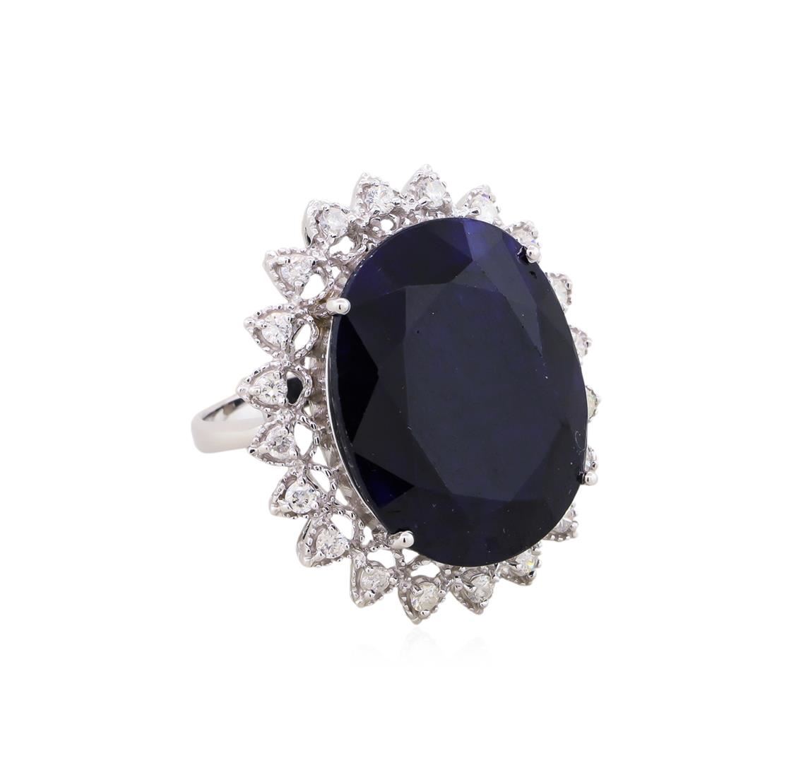 Fourteen Karat (14K) White Gold Sapphire And Diamond Ring. An Oval Cut Sapphire Corundum Gemstone Is Prong Mounted In The Center Of The Ring, Round Brilliant Cut Diamonds Accent The Ring Around The Center Gemstone. The Ring Is Cast Stamped "14K" And Has A Gross Weight Of 17.1 Grams. Diamonds: Shape: Round Brilliant Cut, Weight: 0.80 Carat, Average Clarity: Il, Average Color: H-J, Symmetry: Very Good, Polish: Very Good, Gemstone: Sapphire Corundum. Nature: Natural, Shape: Oval, Faceted, Quantity; 1 Mounted, Weight: 42.51 Carat, Center Stone Dimensions: Length-24.40 Mm; Width 19.53 Mm. Bulge: Visible, Clarity Si Type 3, Color: Blue (5/5), Symmetry: Very Good, Color Intensity: Medium, Transparency: Transparent, Tone: Dark. Comments: Indications Of High Temperature And Diffusion. Metal: Gold Stamped, Purity: 14K, Color: White, Condition: Excellent, Finish: High Polish. GGA Appraised at $7,890.00.