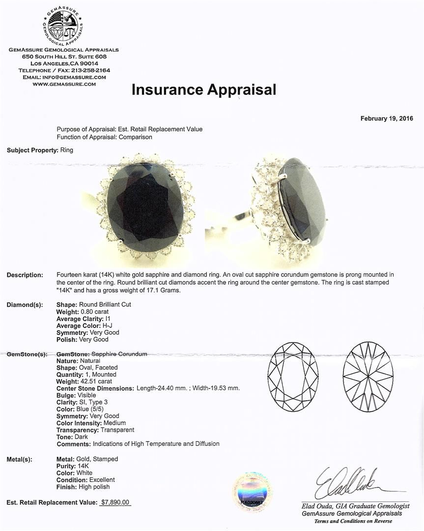 Fourteen Karat (14K) White Gold Sapphire And Diamond Ring. An Oval Cut Sapphire Corundum Gemstone Is Prong Mounted In The Center Of The Ring, Round Brilliant Cut Diamonds Accent The Ring Around The Center Gemstone. The Ring Is Cast Stamped "14K" And Has A Gross Weight Of 17.1 Grams. Diamonds: Shape: Round Brilliant Cut, Weight: 0.80 Carat, Average Clarity: Il, Average Color: H-J, Symmetry: Very Good, Polish: Very Good, Gemstone: Sapphire Corundum. Nature: Natural, Shape: Oval, Faceted, Quantity; 1 Mounted, Weight: 42.51 Carat, Center Stone Dimensions: Length-24.40 Mm; Width 19.53 Mm. Bulge: Visible, Clarity Si Type 3, Color: Blue (5/5), Symmetry: Very Good, Color Intensity: Medium, Transparency: Transparent, Tone: Dark. Comments: Indications Of High Temperature And Diffusion. Metal: Gold Stamped, Purity: 14K, Color: White, Condition: Excellent, Finish: High Polish. GGA Appraised at $7,890.00.