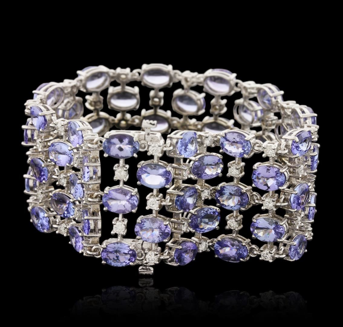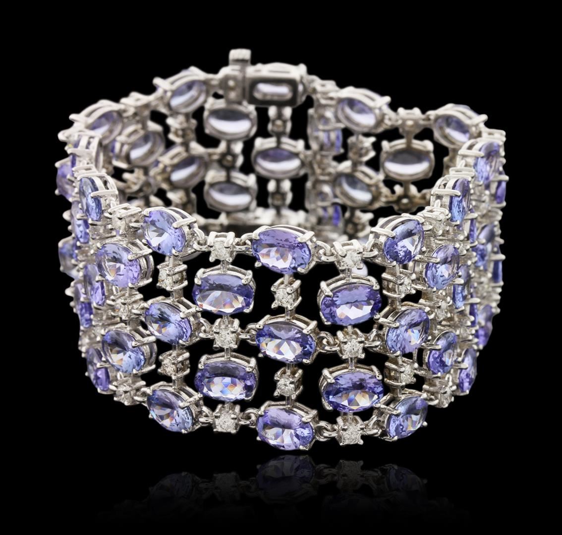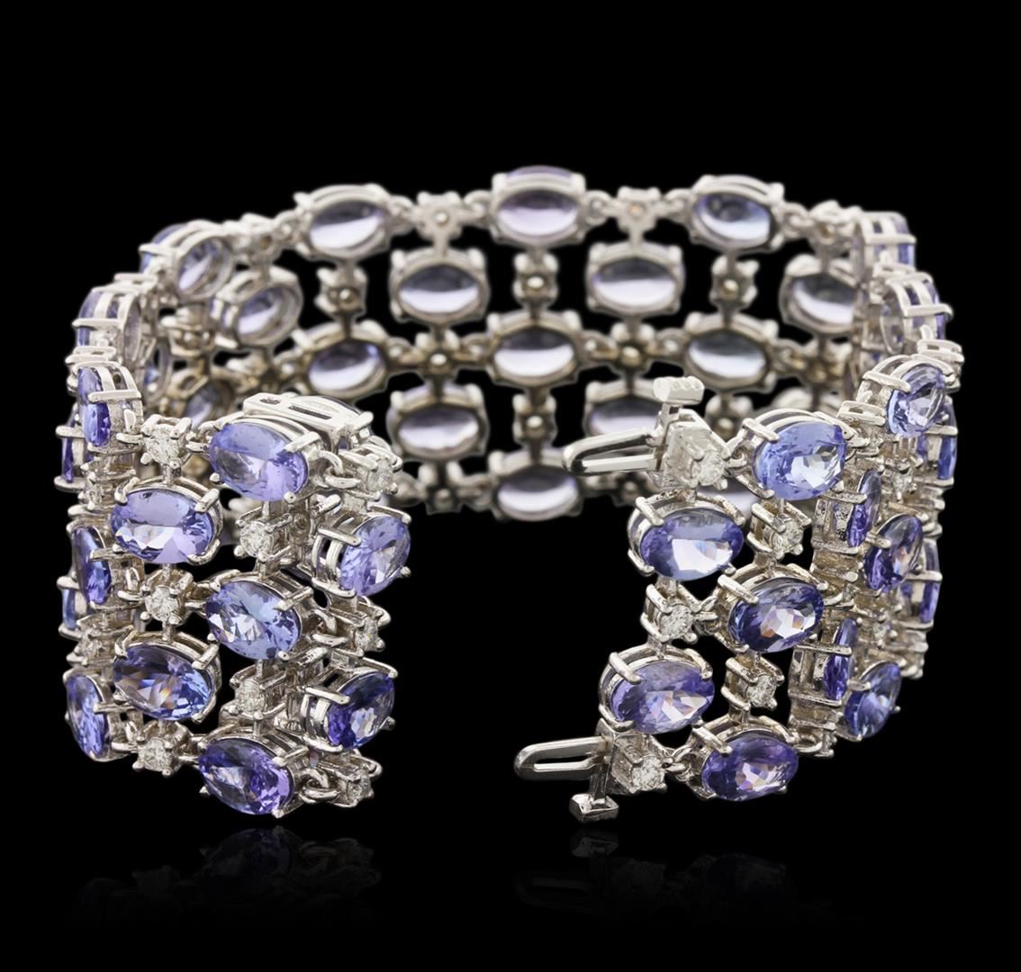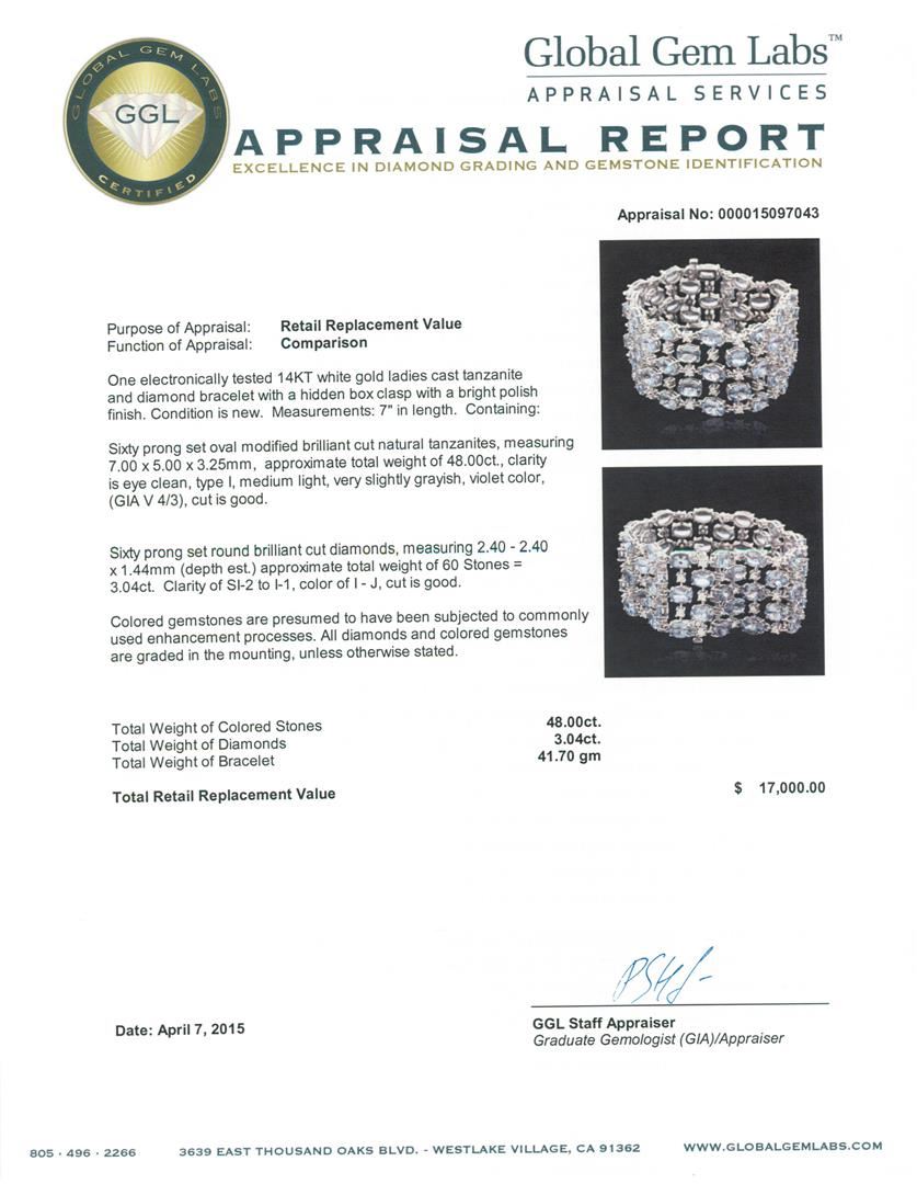 One electronically tested 14KT white gold ladies cast tanzanite and diamond bracelet with a hidden box clasp with a bright polish finish. Measurements: 7" in length. Condition is new. Containing: Sixty prong set oval modified brilliant cut natural tanzanites, measuring 7.00. x 5.00. x 3.25mm, approximate total weight of 48.00.ct., clarity is eye clean, type I, medium light, very slightly grayish, violet color, (GIA V 4/3), cut is good. Sixty prong set round brilliant cut diamonds, measuring 2.40 - 2.40 x 1.44mm (depth est.) approximate total weight of 60 Stones = 3.04ct. Clarity: SI-2 to I-1. Color: I - J, Cut is Good. Colored gemstones are presumed to have been subjected to commonly used enhancement processes. All diamonds and colored gemstones are graded in the mounting, unless otherwise stated. Total Weight of Colored Stones 48.00.ct. Total Weight of Diamonds 3.04ct. Total Weight of Bracelet 41.70 grams. GGL Appraised at $17,000.00.