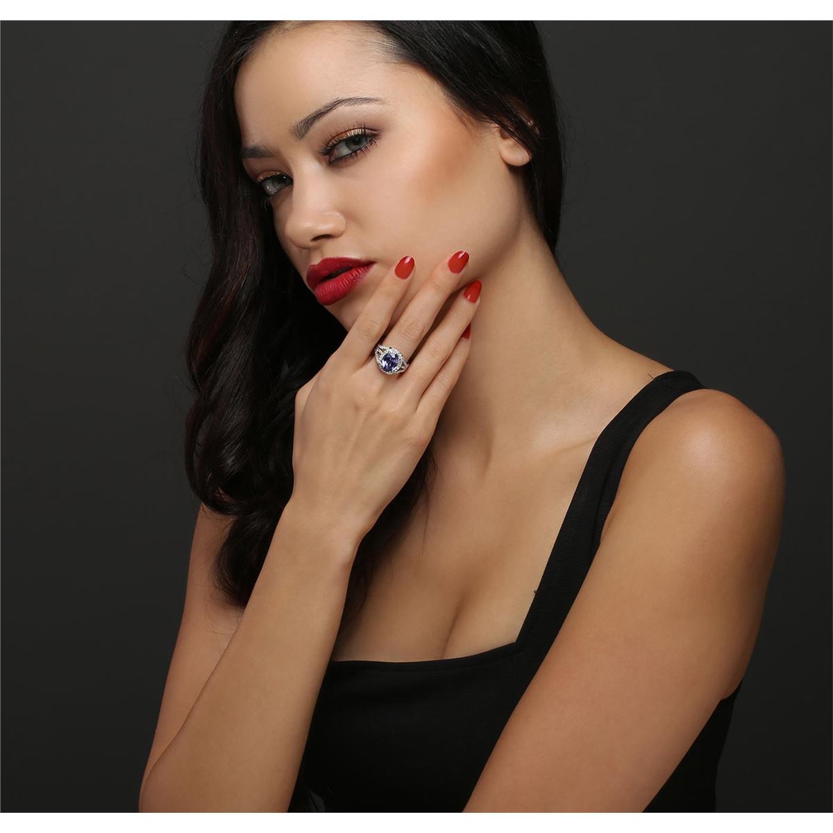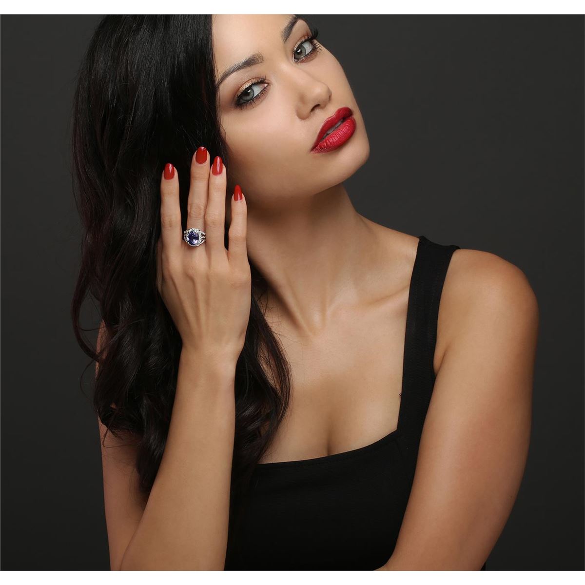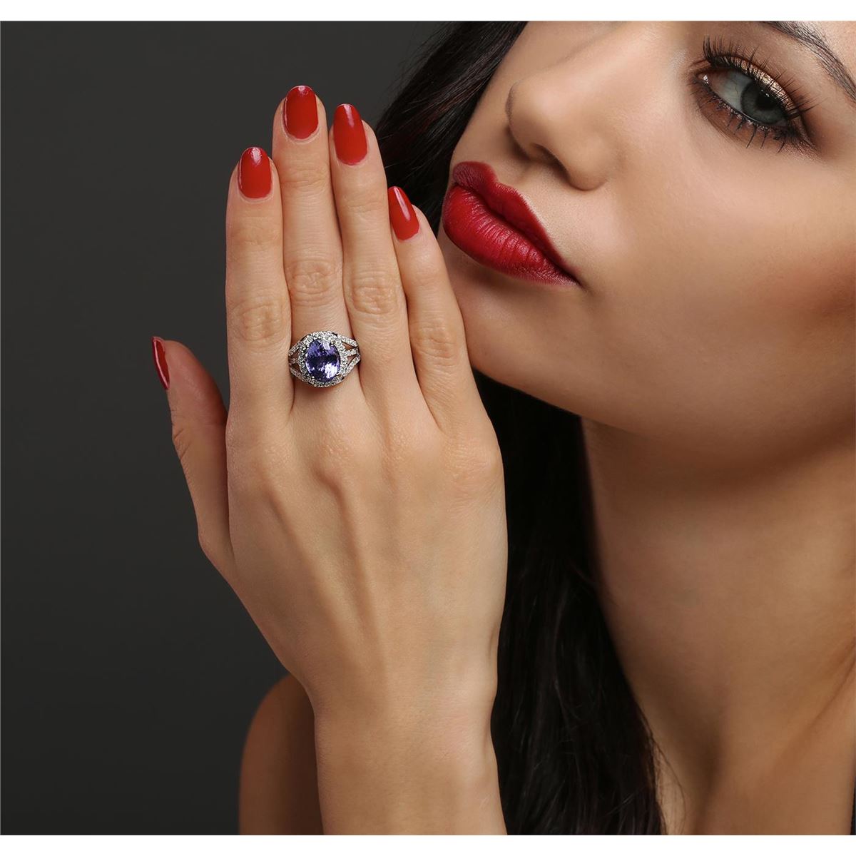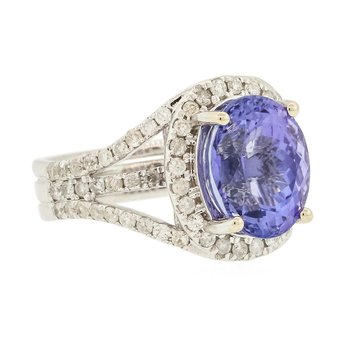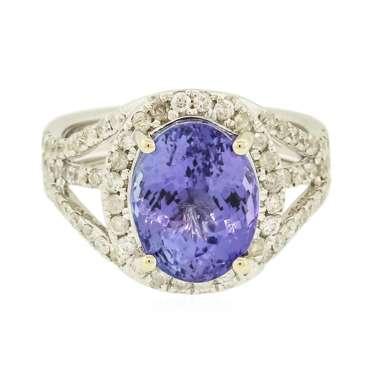 One electronically tested 14KT white gold ladies cast tanzanite and diamond ring with a bright polish finish. The featured tanzanite is set within a diamond bezel supported by diamond set three-way split shoulders, competed by a grooved five millimeter wide band. Trademark is Orianne. Identified with markings of "14K". Condition is new, good workmanship. Containing: One prong set oval brilliant cut natural tanzanite, measuring 11.50 x 9.00 x 6.70mm, 6% bulge factor, approximate weight of 5.00ct., clarity is eye clean, type I, medium dark, very slightly grayish, bluish violet color, (GIA bV 6/3), cut is good. Transmitting light with no distortion, transparent. Colored Stone Grading Report attached. Graded in the setting. Tanzanite is a very rare gemstone that is only found in the country of Tanzania. Originally discovered in 1967. Tiffany & Company, named the stone Tanzanite. It is found in the Usumburu Mountains that border the Umba Valley of northern Tanzania. Tanzanite occurs in gray, brown, violet, blue, reddish-purple, & green. The gem is interesting because of its exceptional pleochroism. Rotated in different directions a tanzanite will exhibit multiple changes of color. Tanzanite has a low tolerance to ultrasonic cleaning, and should not be cleaned using this method. Seventy-Four prong set round brilliant cut diamonds, measuring 1.50 - 1.40 x 0.87mm (depth est.) approximate total weight of 74 Stones = 0.92ct. Graded in the setting. Clarity: I-2 to I-3. Color: H - J. Total Weight of Colored Stones 5.00ct. Total Weight of Diamonds 0.92ct. Total Weight of Ring 7.00 grams. AIG Appraised at $15,385.00.