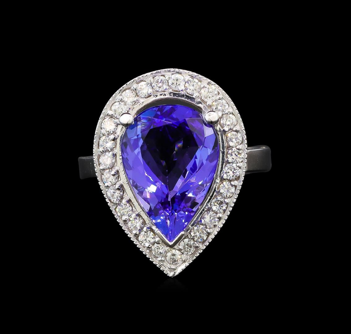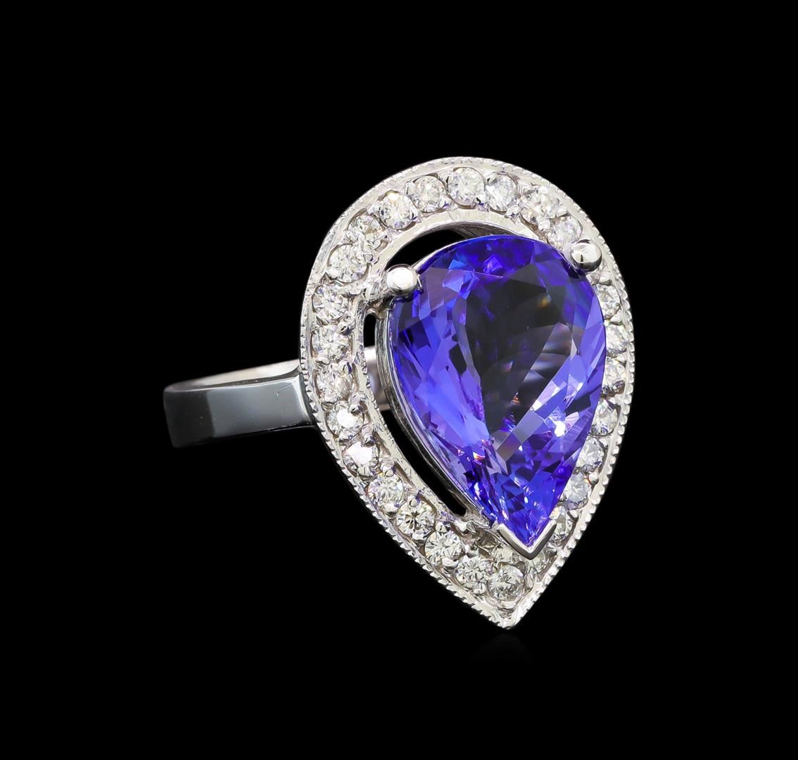 One electronically tested 14KT white gold ladies cast tanzanite and diamond ring with a bright polish finish. Identified with markings of "K14". Condition is new. Containing: One prong set pear modified brilliant cut natural tanzanite, measuring 14.39 x 9.98 x 5.20mm, approximate weight of 5.00ct., clarity is eye clean, type I, medium light, very slightly grayish, violet color, (GIA V 4/3), cut is good. Twenty-Seven prong set round brilliant cut diamonds, measuring 1.50 - 1.50 x 0.90mm (depth est.) approximate. total weight of 27 Stones = 0.33ct. Clarity: SI-1 to SI-2. Color: H - I, Cut is Good. Colored gemstones are presumed to have been subjected to commonly used enhancement processes. All diamonds and colored gemstones are graded in the mounting, unless otherwise stated. Total Weight of Colored Stones 5.00ct. Total Weight of Diamonds 0.33ct. Total Weight of Ring 8.60 grams. GGL Appraised at $4,830.00.