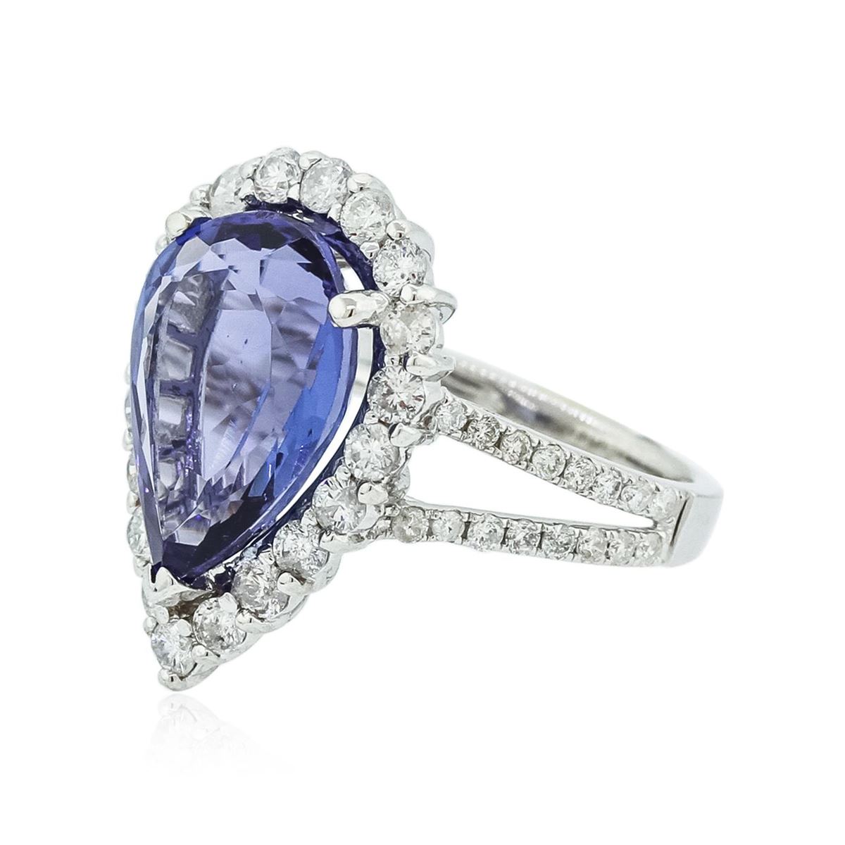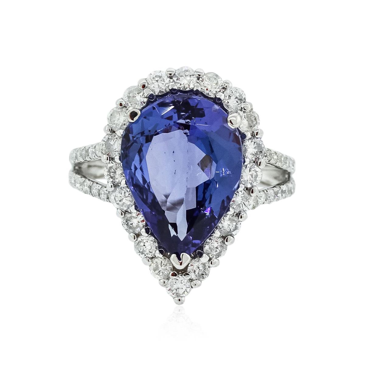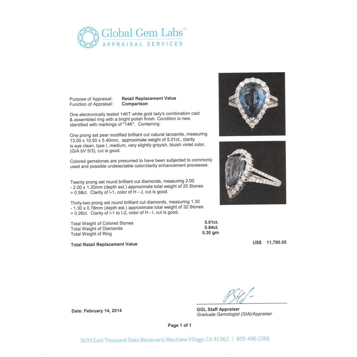 One electronically tested 14KT white gold Ladies combination cast & assembled ring with a bright polish finish. Condition is new. Identified with markings of "14K". Containing: One prong set pear modified brilliant cut natural tanzanite, measuring 13.00 x 10.50 x 5.40mm, approximate weight of 5.01ct., clarity is eye clean, type I, medium, very slightly grayish, bluish violet color, (GIA bV 5/3), cut is good. Colored gemstones are presumed to have been subjected to commonly used and possible undetectable color/clarity enhancement processes. Twenty prong set round brilliant cut diamonds, measuring 2.00 - 2.00 x 1.20mm (depth est.) approximate total weight of 20 Stones = 0.58ct. Clarity of I-1, Color of H - J, Cut is Good. Thirty-Two prong set round brilliant cut diamonds, measuring 1.30 - 1.30 x 0.78mm (depth est.) approximate total weight of 32 Stones = 0.26ct. Clarity of I-1 to I-2, Color of H - I, Cut is Good. Total Weight of Colored Stones 5.01ct. Total Weight of Diamonds 0.84ct. Total Weight of Ring 5.30gm. GGL Appraised at $11,790.00.