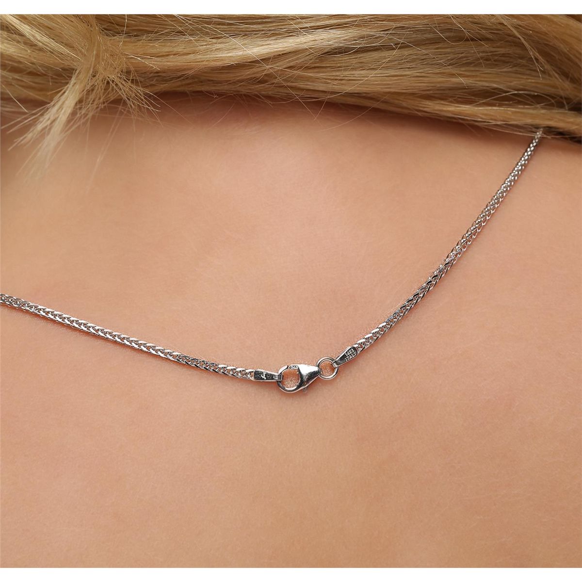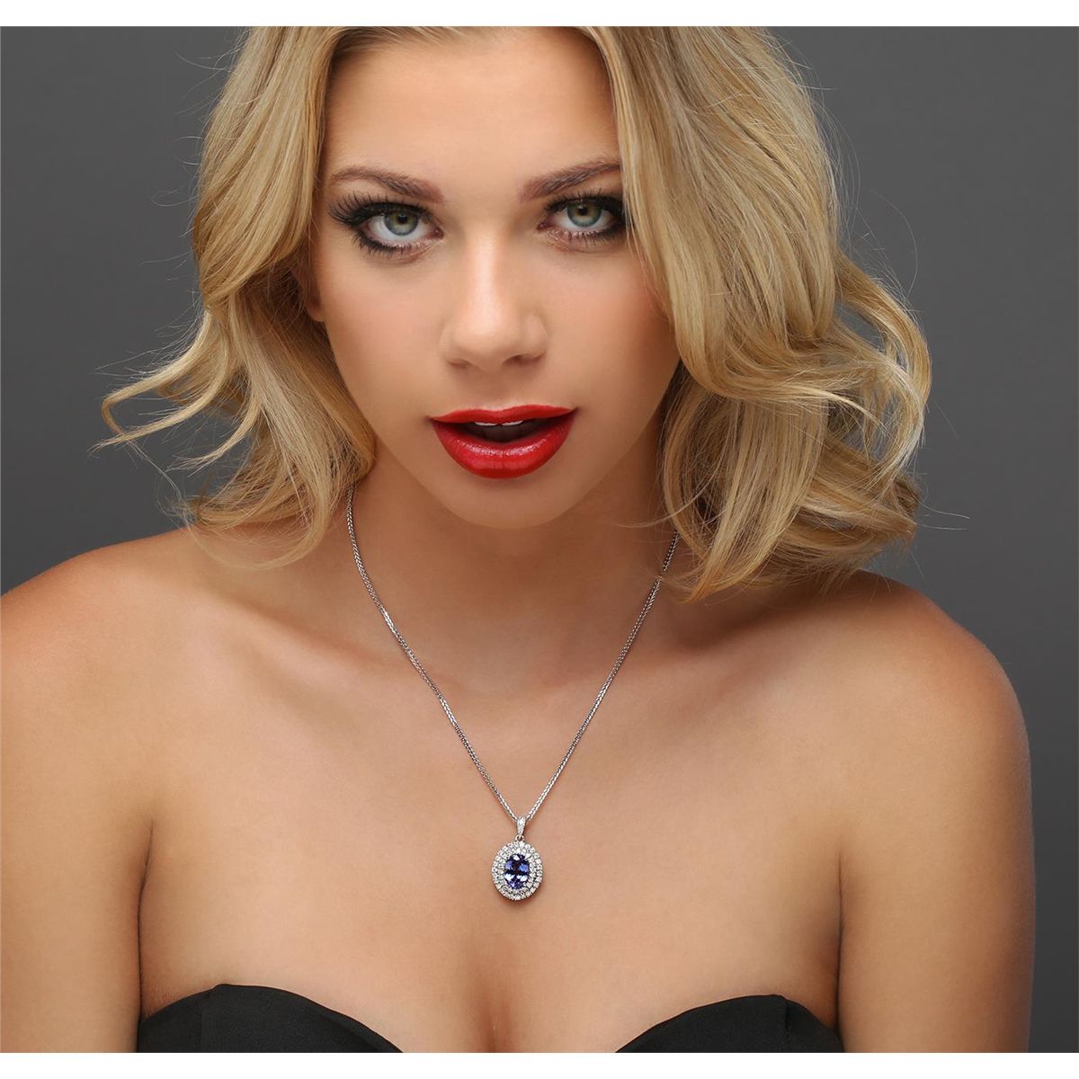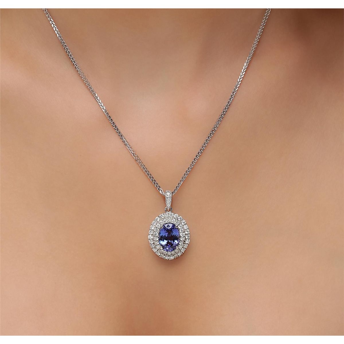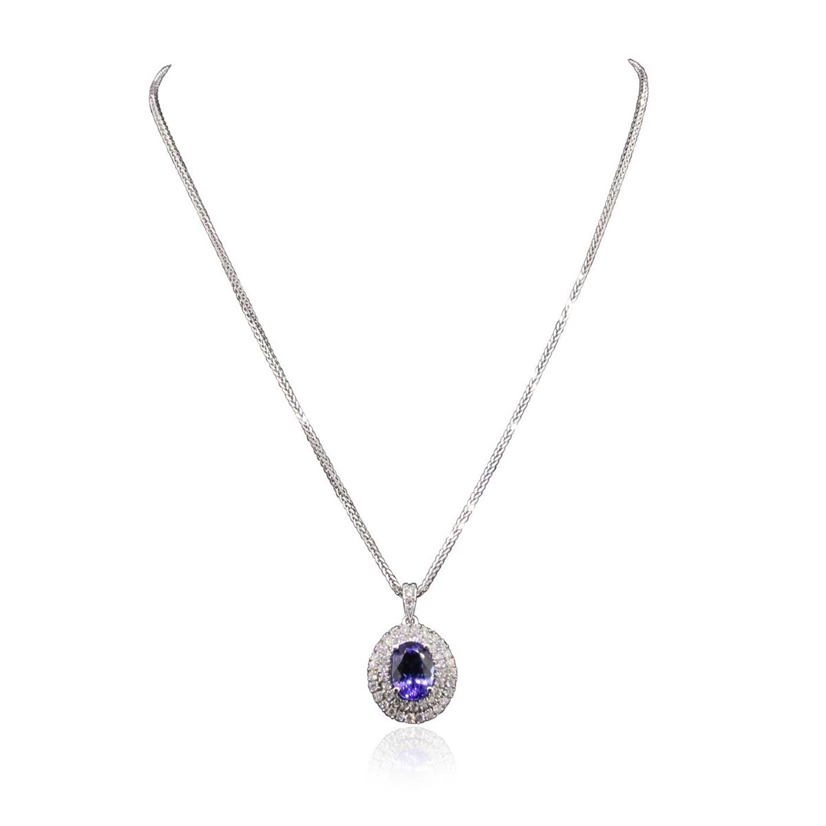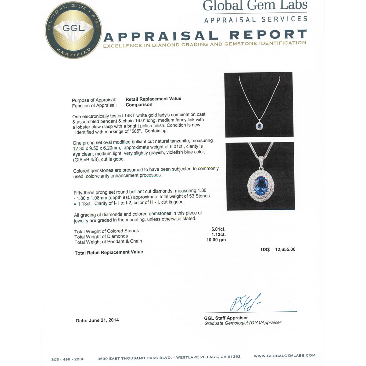 One electronically tested 14KT white gold Ladies combination cast & assembled pendant & chain 16.0" long, medium fancy link with a lobster claw clasp with a bright polish finish. Condition is new. Identified with markings of "585". Containing: One prong set oval modified brilliant cut natural tanzanite, measuring 12.30 x 9.50 x 6.20mm, approximate weight of 5.01ct., clarity is eye clean, medium light, very slightly grayish, violetish blue color, (GIA vB 4/3), cut is good. Colored gemstones are presumed to have been subjected to commonly used color/clarity enhancement processes. Fifty-Three prong set round brilliant cut diamonds, measuring 1.80 - 1.80 x 1.08mm (depth est.) approximate. Total Weight of 53 Stones = 1.13ct. Clarity: I-1 to I-2. Color: H - I, Cut is Good. All grading of diamonds and colored gemstones in this piece of jewelry are graded in the mounting, unless otherwise stated. Total Weight of Colored Stones 5.01ct. Total Weight of Diamonds 1.13ct. Total Weight of Pendant & Chain 10.00 grams. GGL Appraised at $12,655.00.