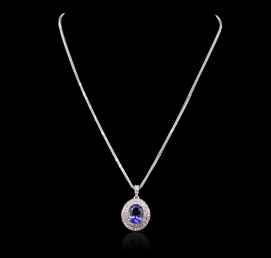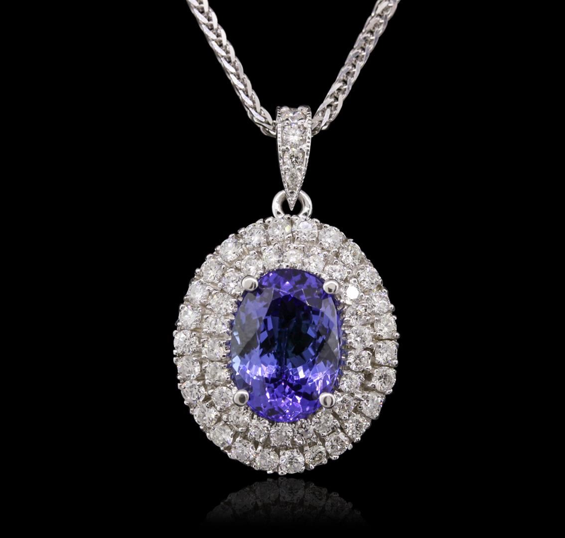 One electronically tested 14KT white gold Ladies combination cast & assembled pendant & chain 16.0" long, medium fancy link with a lobster claw clasp with a bright polish finish. Condition is new. Identified with markings of "585". Containing: One prong set oval modified brilliant cut natural tanzanite, measuring 12.30 x 9.50 x 6.20mm, approximate weight of 5.01ct., clarity is eye clean, medium light, very slightly grayish, violetish blue color, (GIA vB 4/3), cut is good. Colored gemstones are presumed to have been subjected to commonly used color/clarity enhancement processes. Fifty-Three prong set round brilliant cut diamonds, measuring 1.80 - 1.80 x 1.08mm (depth est.) approximate. Total Weight of 53 Stones = 1.13ct. Clarity: I-1 to I-2. Color: H - I, Cut is Good. All grading of diamonds and colored gemstones in this piece of jewelry are graded in the mounting, unless otherwise stated. Total Weight of Colored Stones 5.01ct. Total Weight of Diamonds 1.13ct. Total Weight of Pendant & Chain 10.00 grams. GGL Appraised at $12,655.00.
