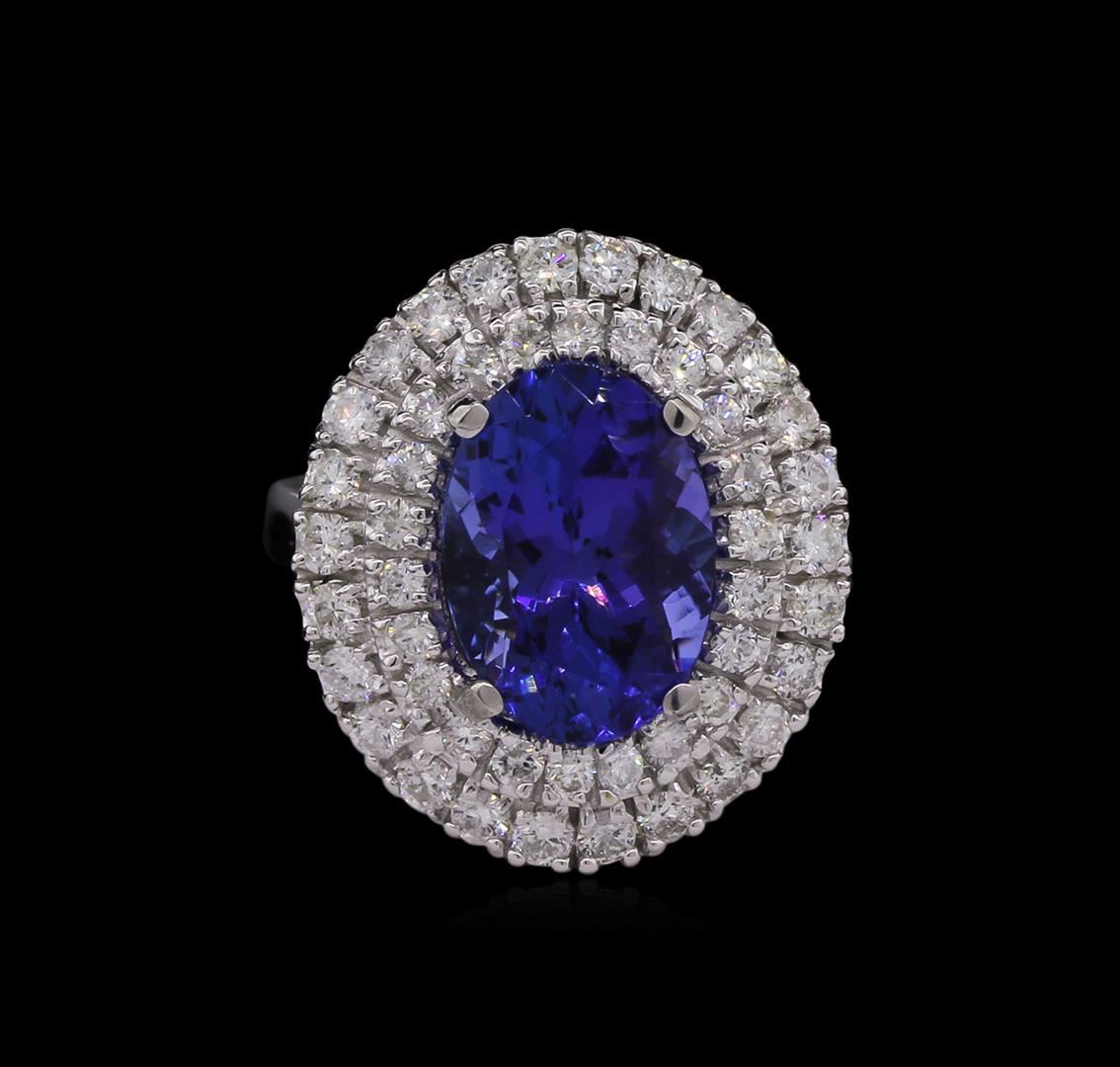 One electronically tested 14KT white gold Ladies combination cast & assembled ring with a bright polish finish. Condition is new. Identified with markings of "K14". Containing: One prong set oval modified brilliant cut natural tanzanite, measuring 12.95 x 9.30 x 6.05mm, approximate total weight of 5.02ct., clarity is eye clean, type I, medium light, moderately strong, violetish blue color, (GIA vB 4/4), cut is good. Forty-Eight prong set round brilliant cut diamonds, measuring 1.90 - 1.40 x 0.99mm (depth est.) approximate total weight of 48 Stones = 1.00ct. Clarity: I-1 to I-2. Color: I - J, Cut is Good. Colored gemstones are presumed to have been subjected to commonly used enhancement processes. All diamonds and colored gemstones are graded in the mounting, unless otherwise stated. Total Weight of Colored Stones 5.02ct. Total Weight of Diamonds 1.00ct. Total Weight of Ring 7.60 grams. GGL Appraised at $10,695.00.