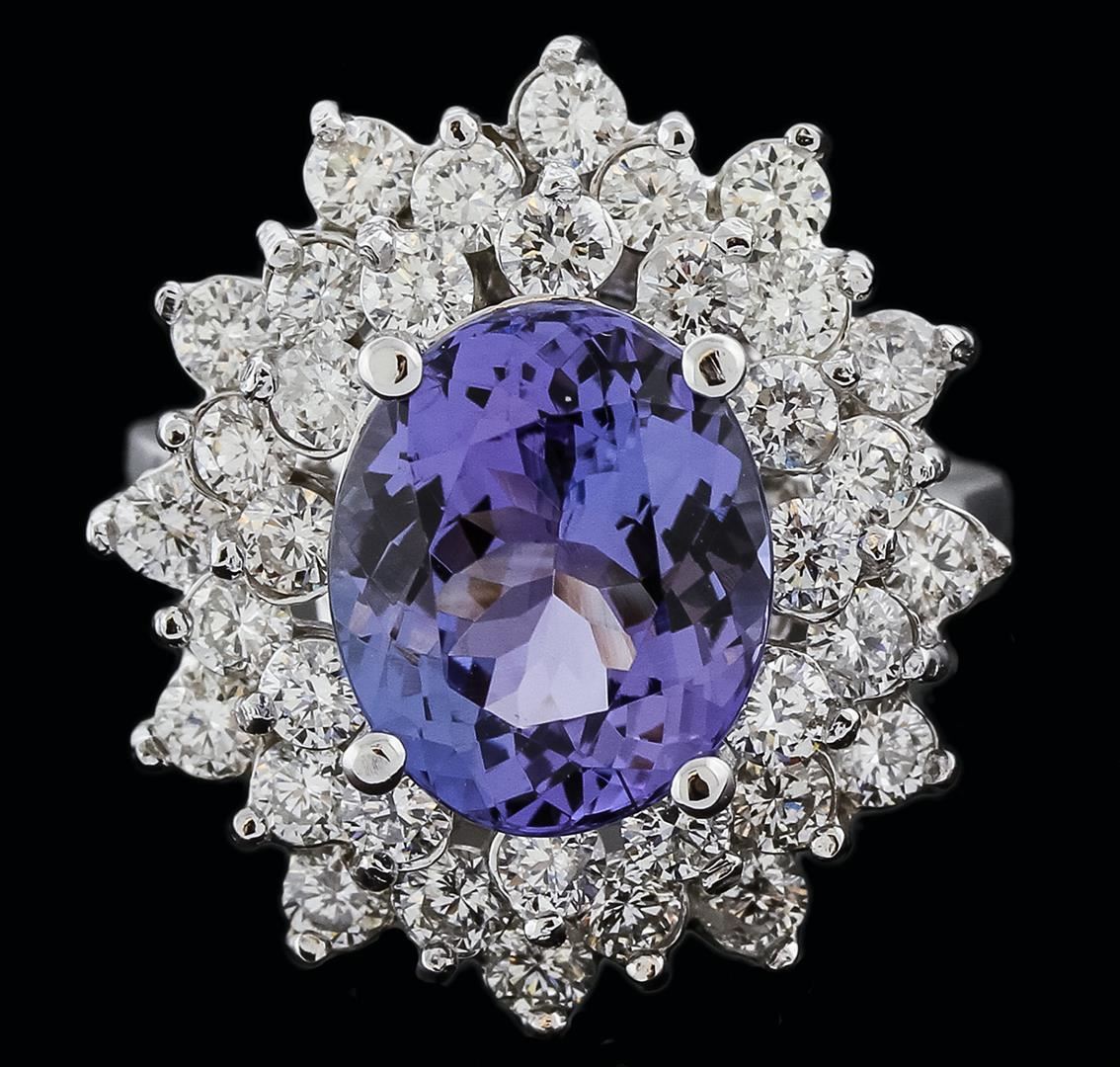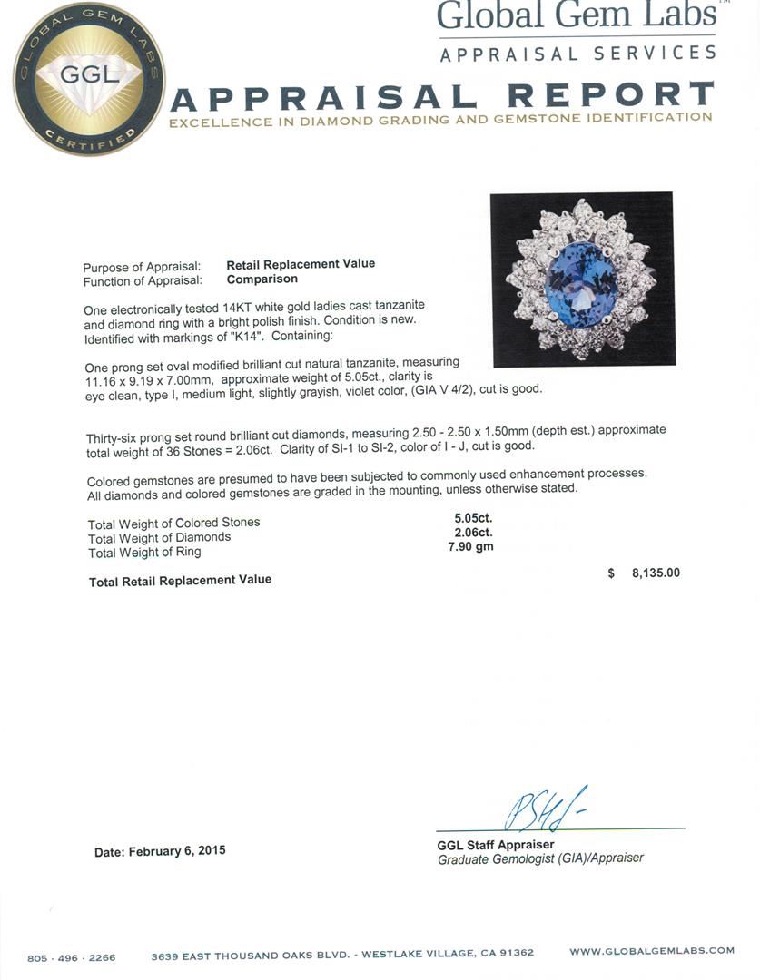 One electronically tested 14KT white gold ladies cast tanzanite and diamond ring with a bright polish finish. Identified with markings of "K14". Condition is new. Containing: One prong set oval modified brilliant cut natural tanzanite, measuring 11.16 x 9.19 x 7.00mm, approximate weight of 5.05ct., clarity is eye clean, type I, medium light, slightly grayish, violet color, (GIA V 4/2), cut is good. Thirty-Six prong set round brilliant cut diamonds, measuring 2.50 - 2.50 x 1.50mm (depth est.) approximate. Total Weight of 36 Stones = 2.06ct. Clarity: SI-1 to SI-2. Color: I - J, Cut is Good. Colored gemstones are presumed to have been subjected to commonly used enhancement processes. All diamonds and colored gemstones are graded in the mounting, unless otherwise stated. Total Weight of Colored Stones 5.05ct. Total Weight of Diamonds 2.06ct. Total Weight of Ring 7.90 grams. GGL Appraised at $8,135.00.