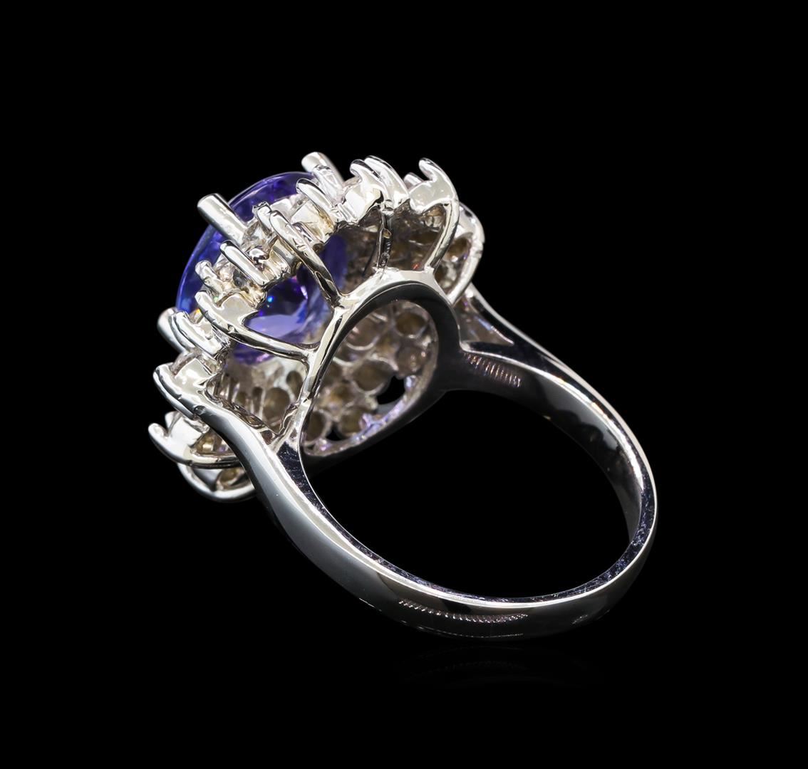 One electronically tested 14KT white gold ladies cast tanzanite and diamond ring with a bright polish finish. Identified with markings of "K14". Condition is new. Containing: One prong set oval modified brilliant cut natural tanzanite, measuring 11.16 x 9.19 x 7.00mm, approximate weight of 5.05ct., clarity is eye clean, type I, medium light, slightly grayish, violet color, (GIA V 4/2), cut is good. Thirty-Six prong set round brilliant cut diamonds, measuring 2.50 - 2.50 x 1.50mm (depth est.) approximate. Total Weight of 36 Stones = 2.06ct. Clarity: SI-1 to SI-2. Color: I - J, Cut is Good. Colored gemstones are presumed to have been subjected to commonly used enhancement processes. All diamonds and colored gemstones are graded in the mounting, unless otherwise stated. Total Weight of Colored Stones 5.05ct. Total Weight of Diamonds 2.06ct. Total Weight of Ring 7.90 grams. GGL Appraised at $8,135.00.