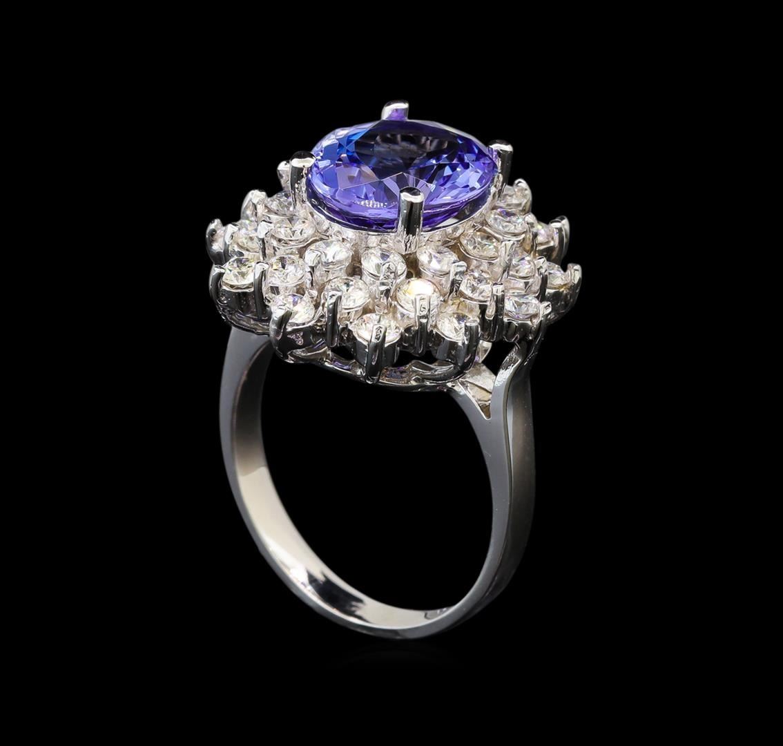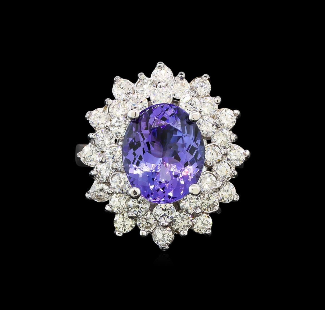 One electronically tested 14KT white gold ladies cast tanzanite and diamond ring with a bright polish finish. Identified with markings of "K14". Condition is new. Containing: One prong set oval modified brilliant cut natural tanzanite, measuring 11.16 x 9.19 x 7.00mm, approximate weight of 5.05ct., clarity is eye clean, type I, medium light, slightly grayish, violet color, (GIA V 4/2), cut is good. Thirty-Six prong set round brilliant cut diamonds, measuring 2.50 - 2.50 x 1.50mm (depth est.) approximate. Total Weight of 36 Stones = 2.06ct. Clarity: SI-1 to SI-2. Color: I - J, Cut is Good. Colored gemstones are presumed to have been subjected to commonly used enhancement processes. All diamonds and colored gemstones are graded in the mounting, unless otherwise stated. Total Weight of Colored Stones 5.05ct. Total Weight of Diamonds 2.06ct. Total Weight of Ring 7.90 grams. GGL Appraised.