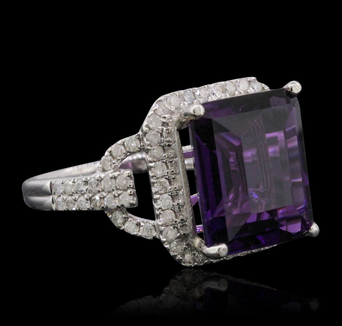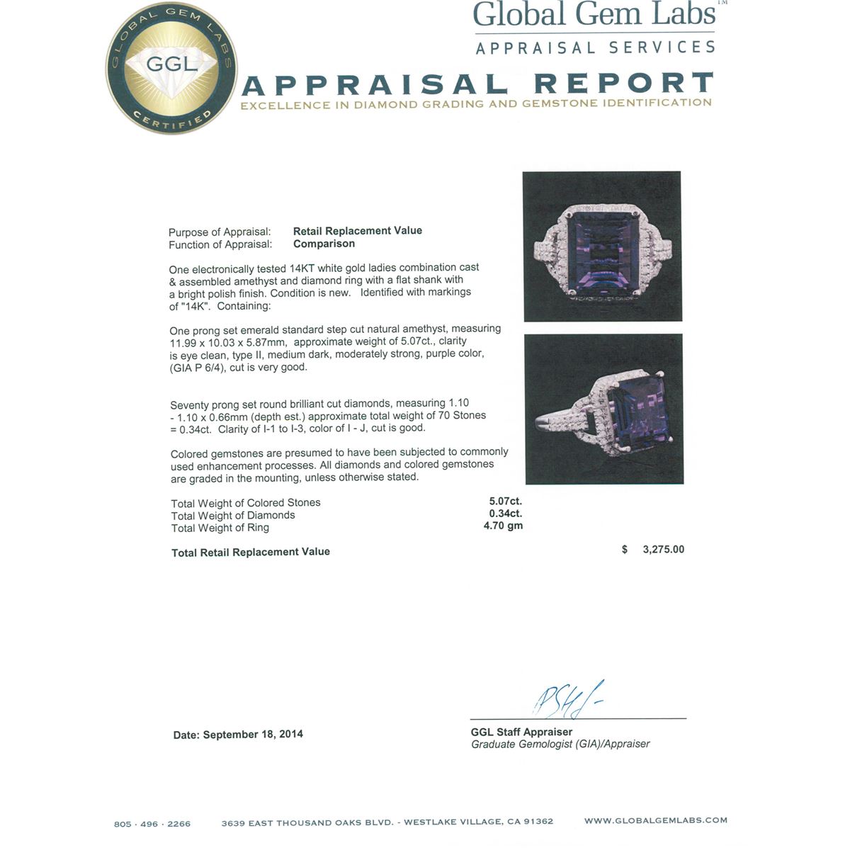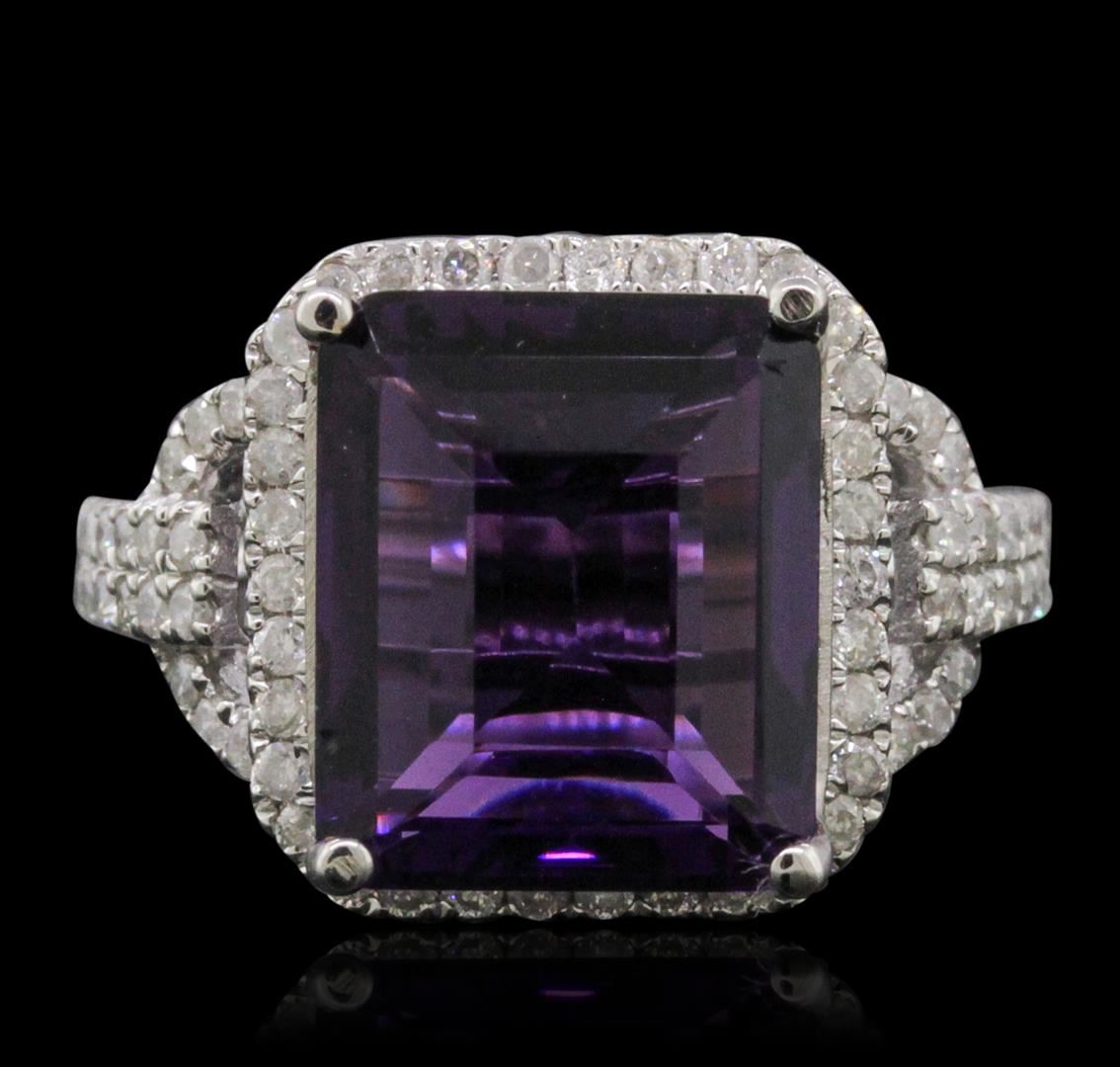 One electronically tested 14KT white gold ladies combination cast & assembled amethyst and diamond ring with a flat shank with a bright polish finish. Identified with markings of "14K". Condition is new. Containing: One prong set emerald standard step cut natural amethyst, measuring 11.99 x 10.03 x 5.87mm, approximate weight of 5.07ct., clarity is eye clean, type II, medium dark, moderately strong, purple color, (GIA P 6/4), cut is very good. Seventy prong set round brilliant cut diamonds, measuring 1.10 - 1.10 x 0.66mm (depth est.) approximate total weight of 70 Stones = 0.34ct. Clarity: I-1 to I-3. Color: I - J, Cut is Good. Colored gemstones are presumed to have been subjected to commonly used enhancement processes. All diamonds and colored gemstones are graded in the mounting, unless otherwise stated. Total Weight of Colored Stones 5.07ct. Total Weight of Diamonds 0.34ct. Total Weight of Ring 4.70 grams. GGL Appraised at $3,275.00.