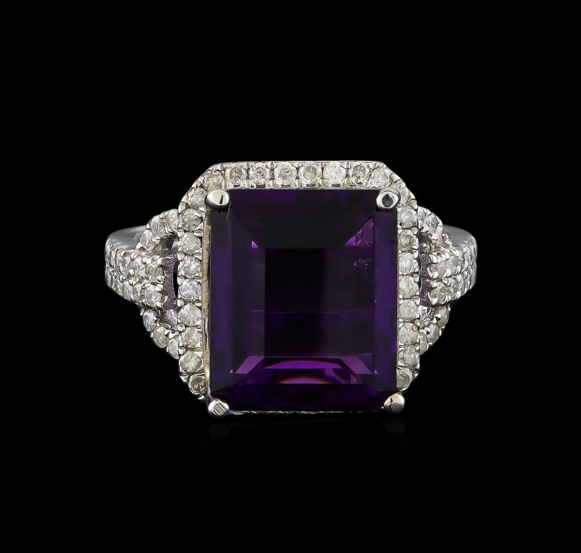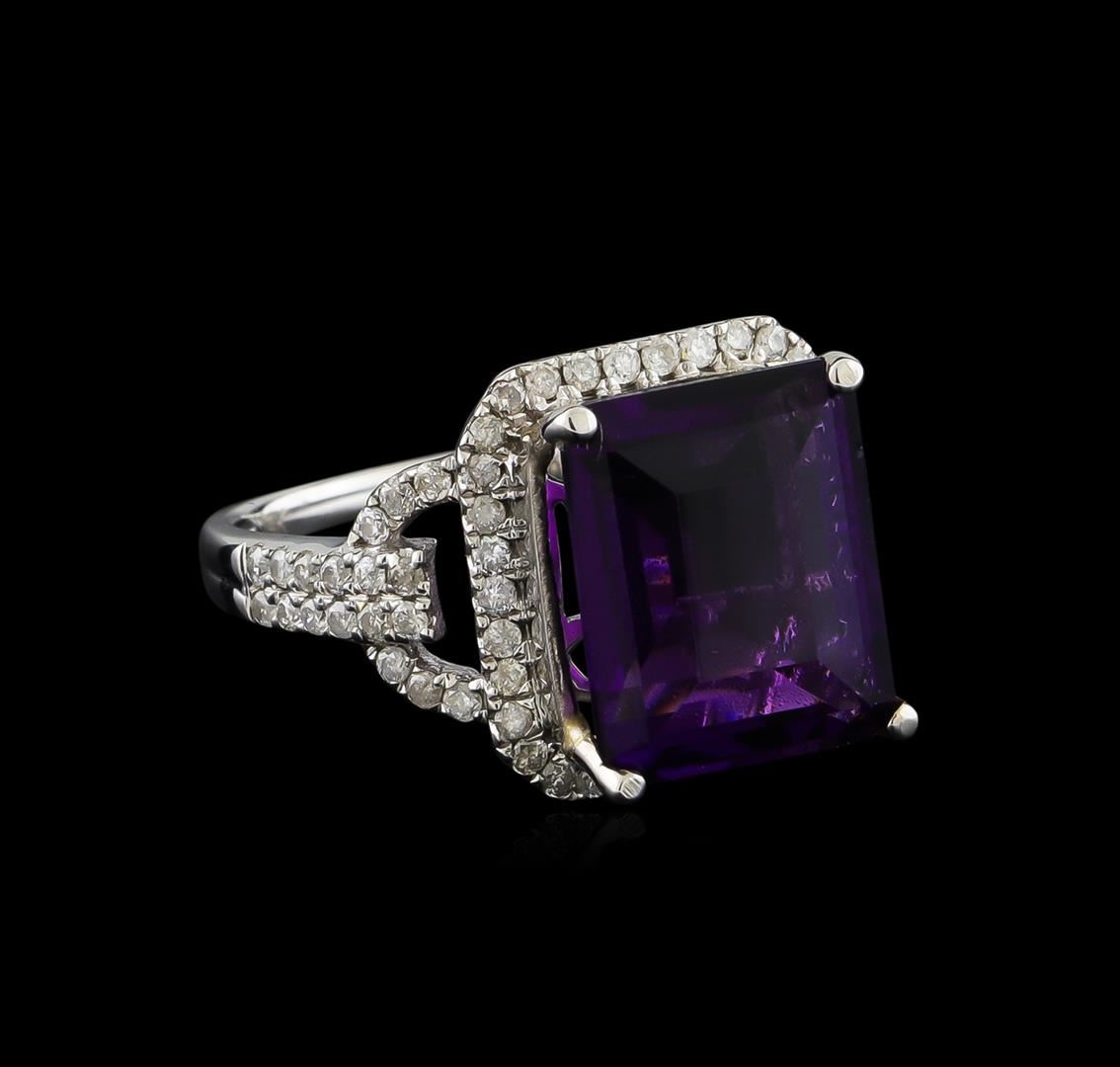 One electronically tested 14KT white gold ladies combination cast & assembled amethyst and diamond ring with a flat shank with a bright polish finish. Identified with markings of "14K". Condition is new. Containing: One prong set emerald standard step cut natural amethyst, measuring 11.99 x 10.03 x 5.87mm, approximate weight of 5.07ct., clarity is eye clean, type II, medium dark, moderately strong, purple color, (GIA P 6/4), cut is very good. Seventy prong set round brilliant cut diamonds, measuring 1.10 - 1.10 x 0.66mm (depth est.) approximate total weight of 70 Stones = 0.34ct. Clarity: I-1 to I-3. Color: I - J, Cut is Good. Colored gemstones are presumed to have been subjected to commonly used enhancement processes. All diamonds and colored gemstones are graded in the mounting, unless otherwise stated. Total Weight of Colored Stones 5.07ct. Total Weight of Diamonds 0.34ct. Total Weight of Ring 4.70 grams. GGL Appraised.
